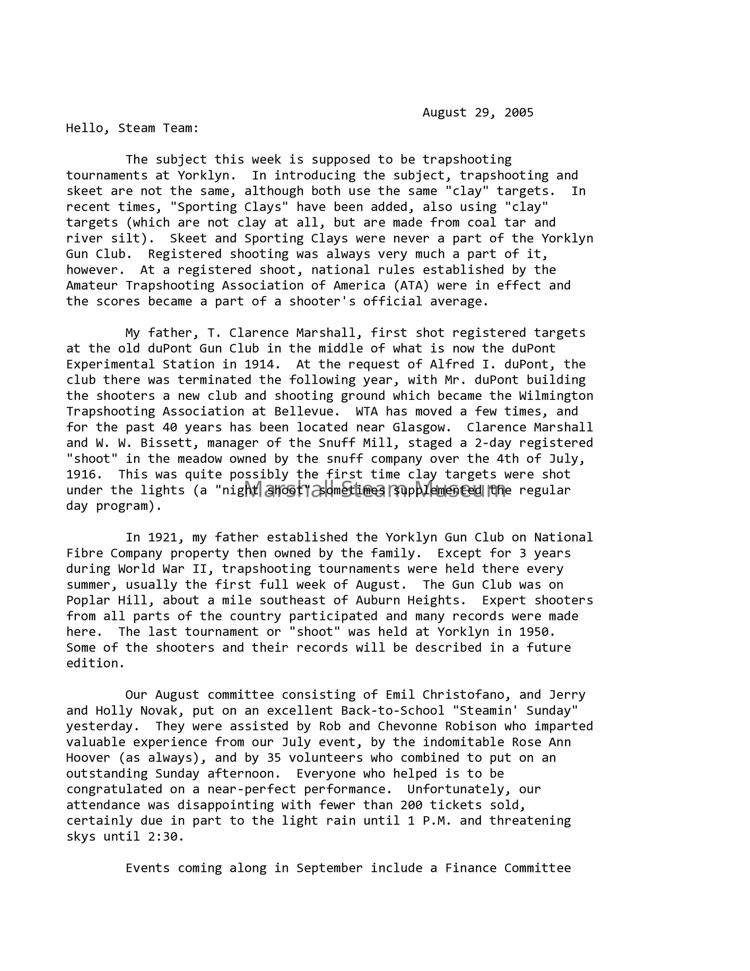 My father, T. Clarence Marshall, first shot registered targets at the old duPont Gun Club in the middle of what is now the duPont Experimental Station in 1914. At the request of Alfred I. duPont, the club there was terminated the following year, with Mr. duPont building the shooters a new club and shooting ground which became the Wilmington Trapshooting Association at Bellevue. WTA has moved a few times, and for the past 40 years has been located near Glasgow. Clarence Marshall and W. W. Bissett, manager of the Snuff Mill, staged a 2-day registered "shoot" in the meadow owned by the snuff company over the 4th of July, 1916. This was quite possibly the first time clay targets were shot under the lights (a "night shoot" sometimes supplemented the regular day program).