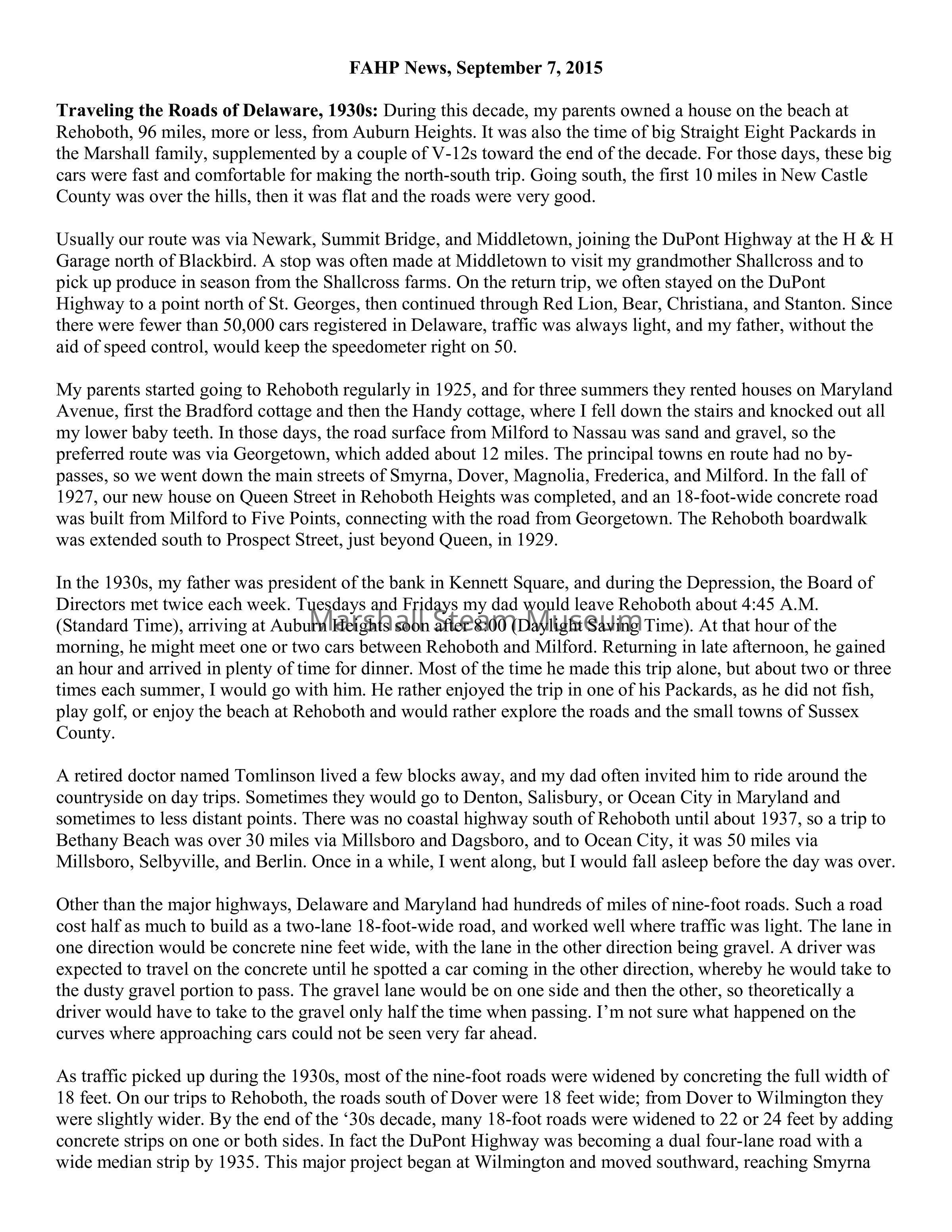 Traveling the Roads of Delaware, 1930s: During this decade, my parents owned a house on the beach at Rehoboth, 96 miles, more or less, from Auburn Heights. It was also the time of big Straight Eight Packards in the Marshall family, supplemented by a couple of V-12s toward the end of the decade. For those days, these big cars were fast and comfortable for making the north-south trip. Going south, the first 10 miles in New Castle County was over the hills, then it was flat and the roads were very good.