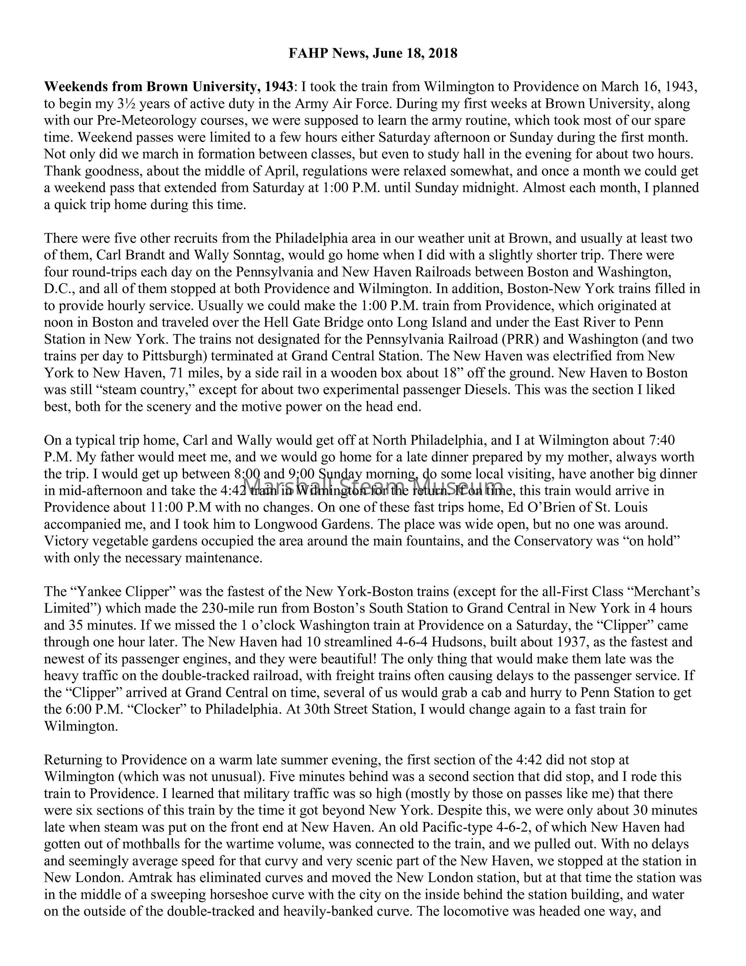 There were five other recruits from the Philadelphia area in our weather unit at Brown, and usually at least two of them, Carl Brandt and Wally Sonntag, would go home when I did with a slightly shorter trip. There were four round-trips each day on the Pennsylvania and New Haven Railroads between Boston and Washington, D.C., and all of them stopped at both Providence and Wilmington. In addition, Boston-New York trains filled in to provide hourly service. Usually we could make the 1:00 P.M. train from Providence, which originated at noon in Boston and traveled over the Hell Gate Bridge onto Long Island and under the East River to Penn Station in New York. The trains not designated for the Pennsylvania Railroad (PRR) and Washington (and two trains per day to Pittsburgh) terminated at Grand Central Station. The New Haven was electrified from New York to New Haven, 71 miles, by a side rail in a wooden box about 18” off the ground. New Haven to Boston was still “steam country,” except for about two experimental passenger Diesels. This was the section I liked best, both for the scenery and the motive power on the head end.