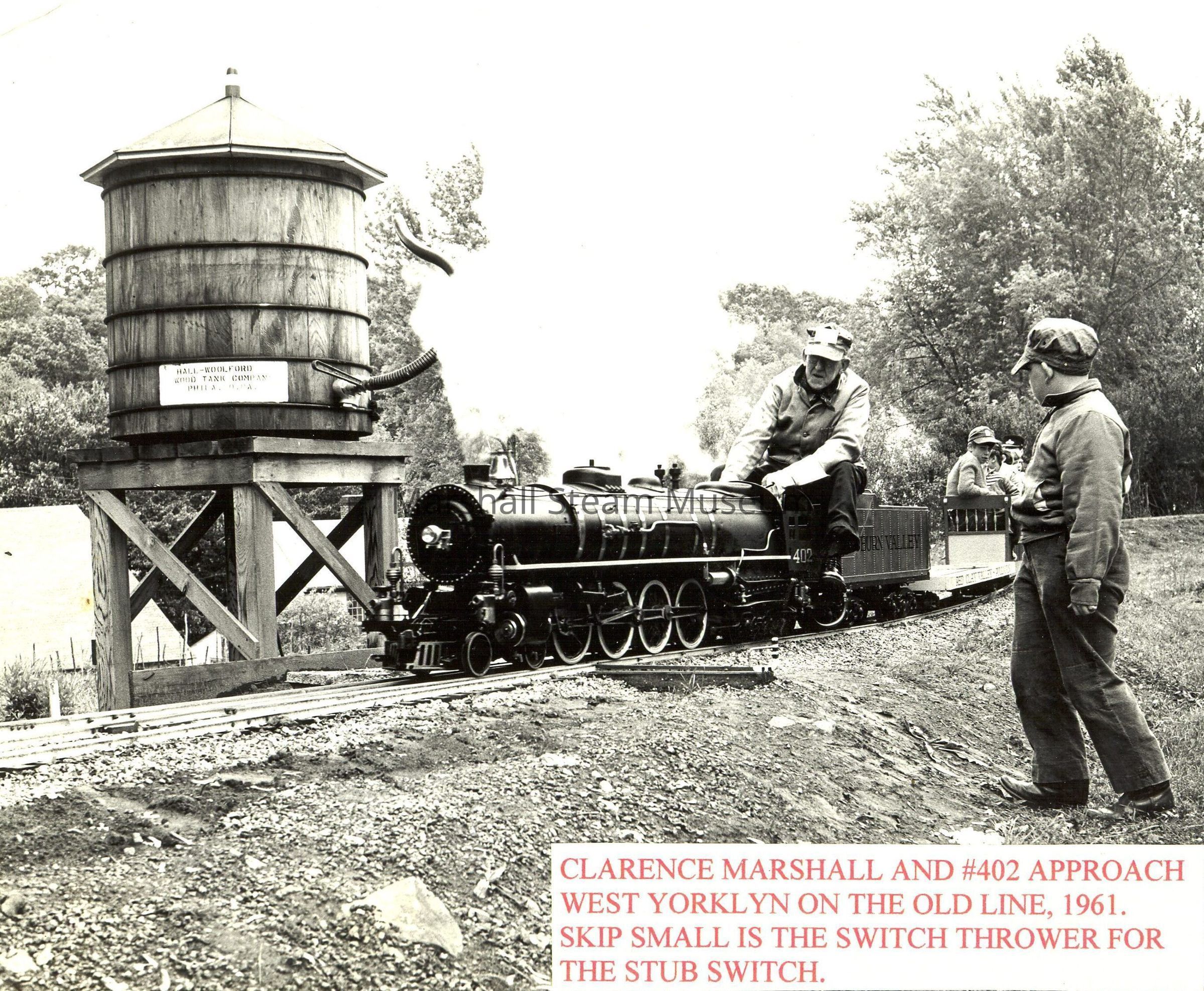 Clarence Marshall and the 402 approaching West Yorklyn Station on the old line in 1961. Skip Small is the switch thrower.Photograph Details