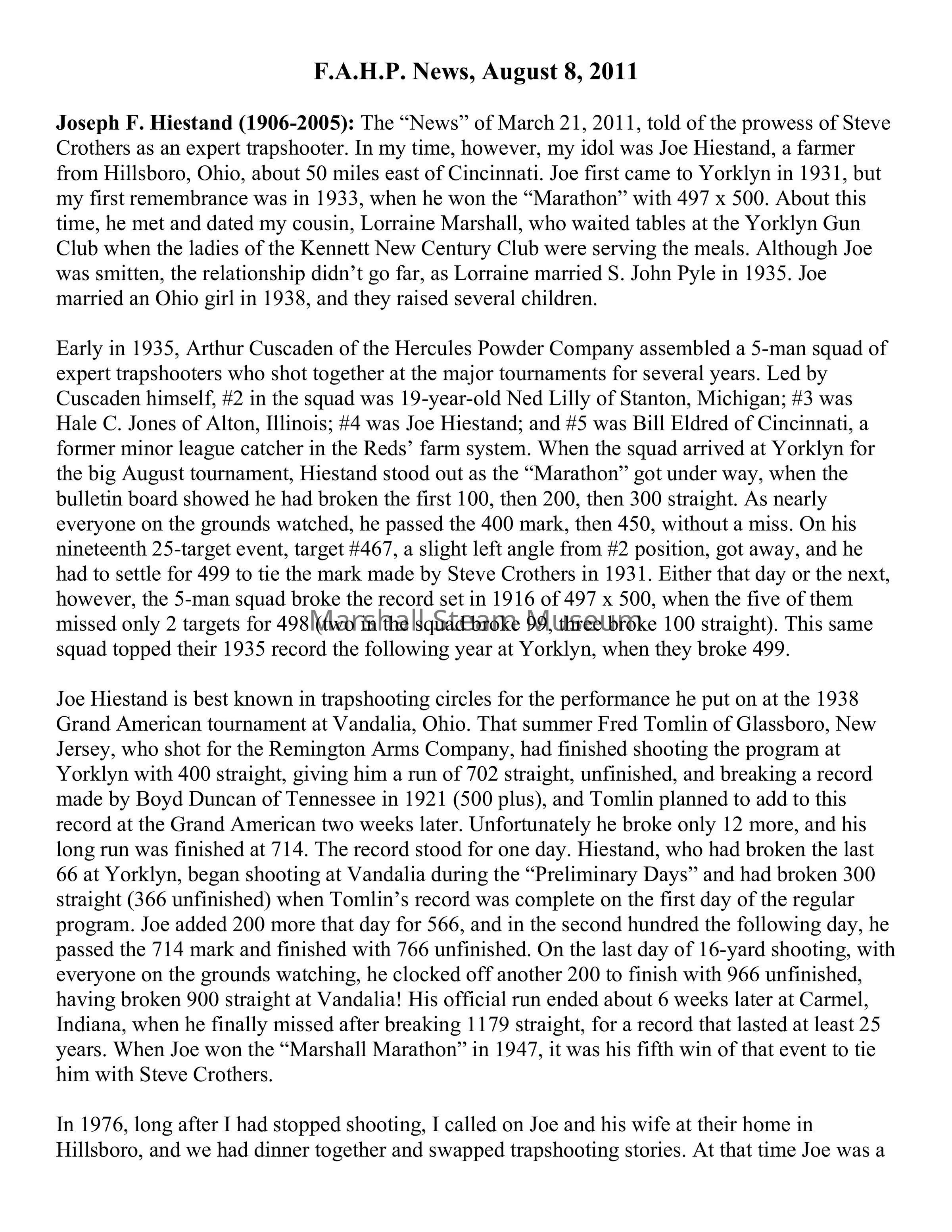 Joseph F. Hiestand (1906-2005): The “News” of March 21, 2011, told of the prowess of Steve Crothers as an expert trapshooter. In my time, however, my idol was Joe Hiestand, a farmer from Hillsboro, Ohio, about 50 miles east of Cincinnati. Joe first came to Yorklyn in 1931, but my first remembrance was in 1933, when he won the “Marathon” with 497 x 500. About this time, he met and dated my cousin, Lorraine Marshall, who waited tables at the Yorklyn Gun Club when the ladies of the Kennett New Century Club were serving the meals. Although Joe was smitten, the relationship didn’t go far, as Lorraine married S. John Pyle in 1935. Joe married an Ohio girl in 1938, and they raised several children.