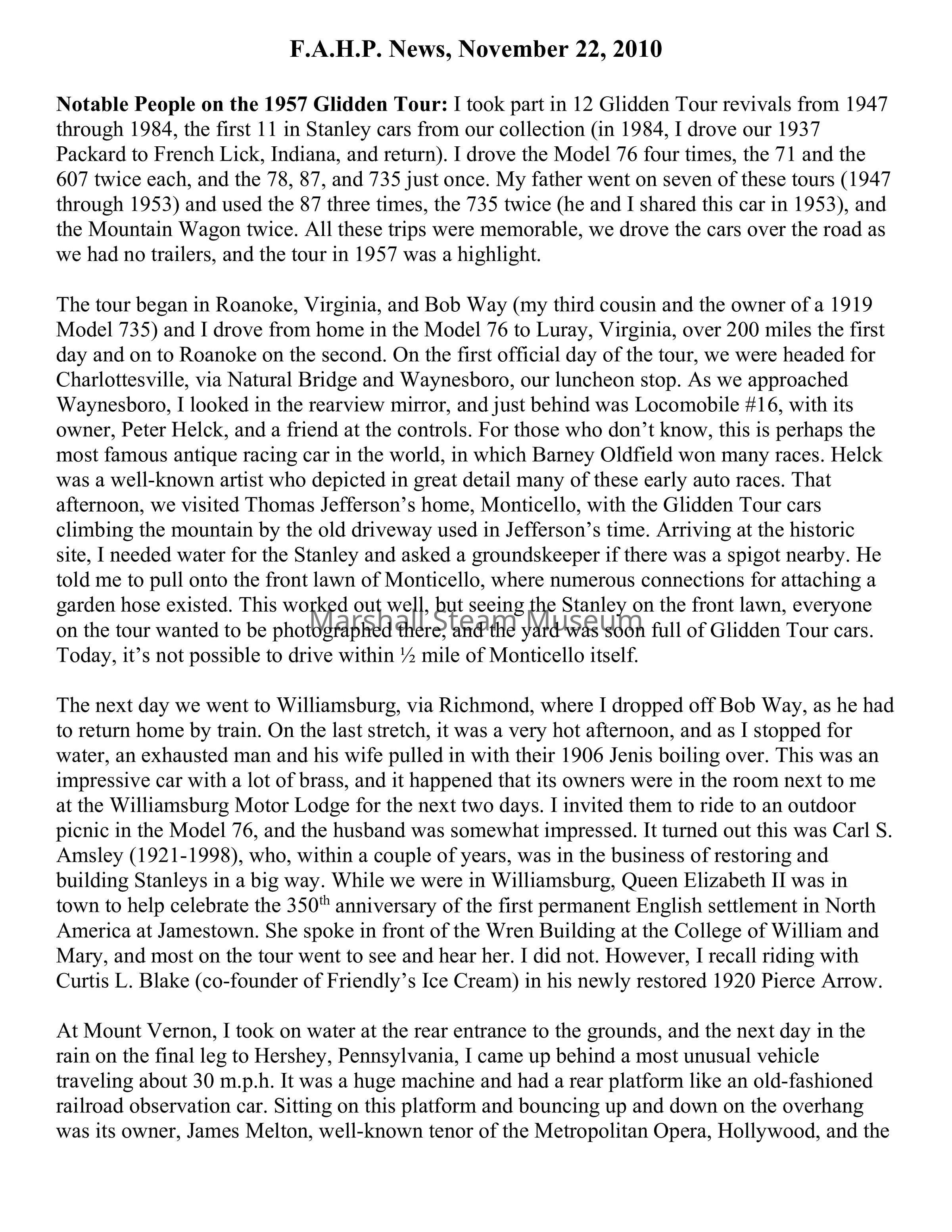 The next day we went to Williamsburg, via Richmond, where I dropped off Bob Way, as he had to return home by train. On the last stretch, it was a very hot afternoon, and as I stopped for water, an exhausted man and his wife pulled in with their 1906 Jenis boiling over. This was an impressive car with a lot of brass, and it happened that its owners were in the room next to me at the Williamsburg Motor Lodge for the next two days. I invited them to ride to an outdoor picnic in the Model 76, and the husband was somewhat impressed. It turned out this was Carl S. Amsley (1921-1998), who, within a couple of years, was in the business of restoring and building Stanleys in a big way. While we were in Williamsburg, Queen Elizabeth II was in town to help celebrate the 350th anniversary of the first permanent English settlement in North America at Jamestown. She spoke in front of the Wren Building at the College of William and Mary, and most on the tour went to see and hear her. I did not. However, I recall riding with Curtis L. Blake (co-founder of Friendly’s Ice Cream) in his newly restored 1920 Pierce Arrow.