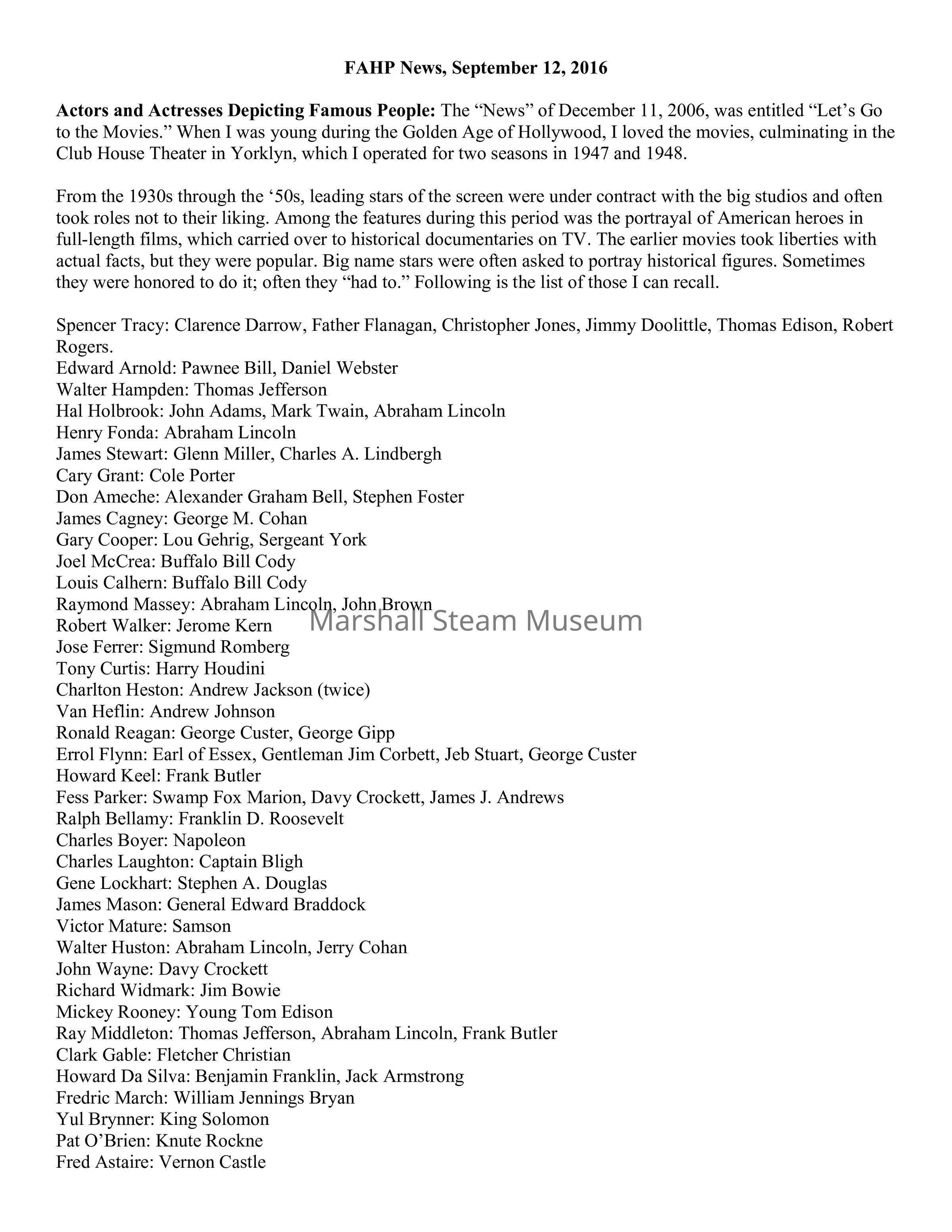 Actors and Actresses Depicting Famous People: The “News” of December 11, 2006, was entitled “Let’s Go to the Movies.” When I was young during the Golden Age of Hollywood, I loved the movies, culminating in the Club House Theater in Yorklyn, which I operated for two seasons in 1947 and 1948.