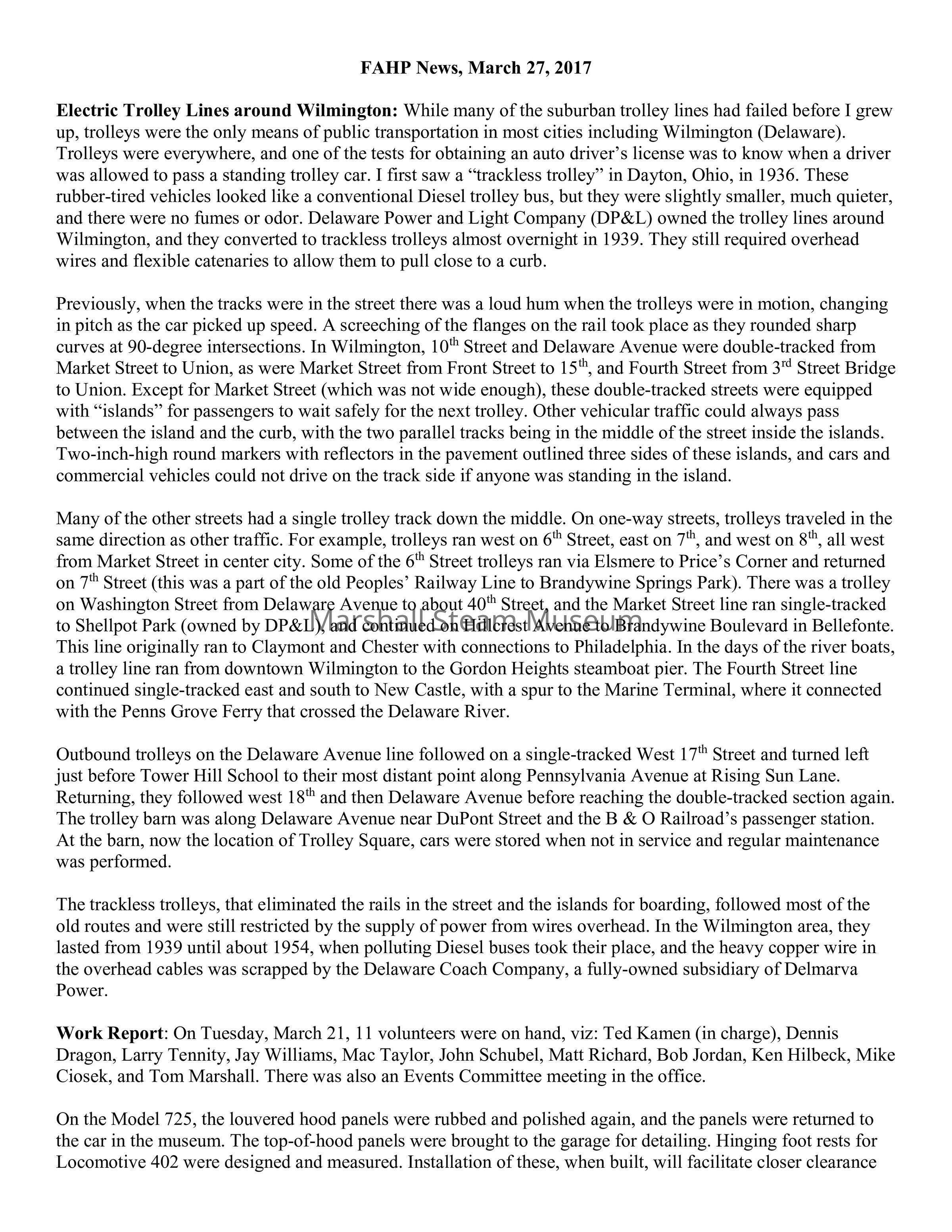 Electric Trolley Lines around Wilmington: While many of the suburban trolley lines had failed before I grew up, trolleys were the only means of public transportation in most cities including Wilmington (Delaware). Trolleys were everywhere, and one of the tests for obtaining an auto driver’s license was to know when a driver was allowed to pass a standing trolley car. I first saw a “trackless trolley” in Dayton, Ohio, in 1936. These rubber-tired vehicles looked like a conventional Diesel trolley bus, but they were slightly smaller, much quieter, and there were no fumes or odor. Delaware Power and Light Company (DP&L) owned the trolley lines around Wilmington, and they converted to trackless trolleys almost overnight in 1939. They still required overhead wires and flexible catenaries to allow them to pull close to a curb.