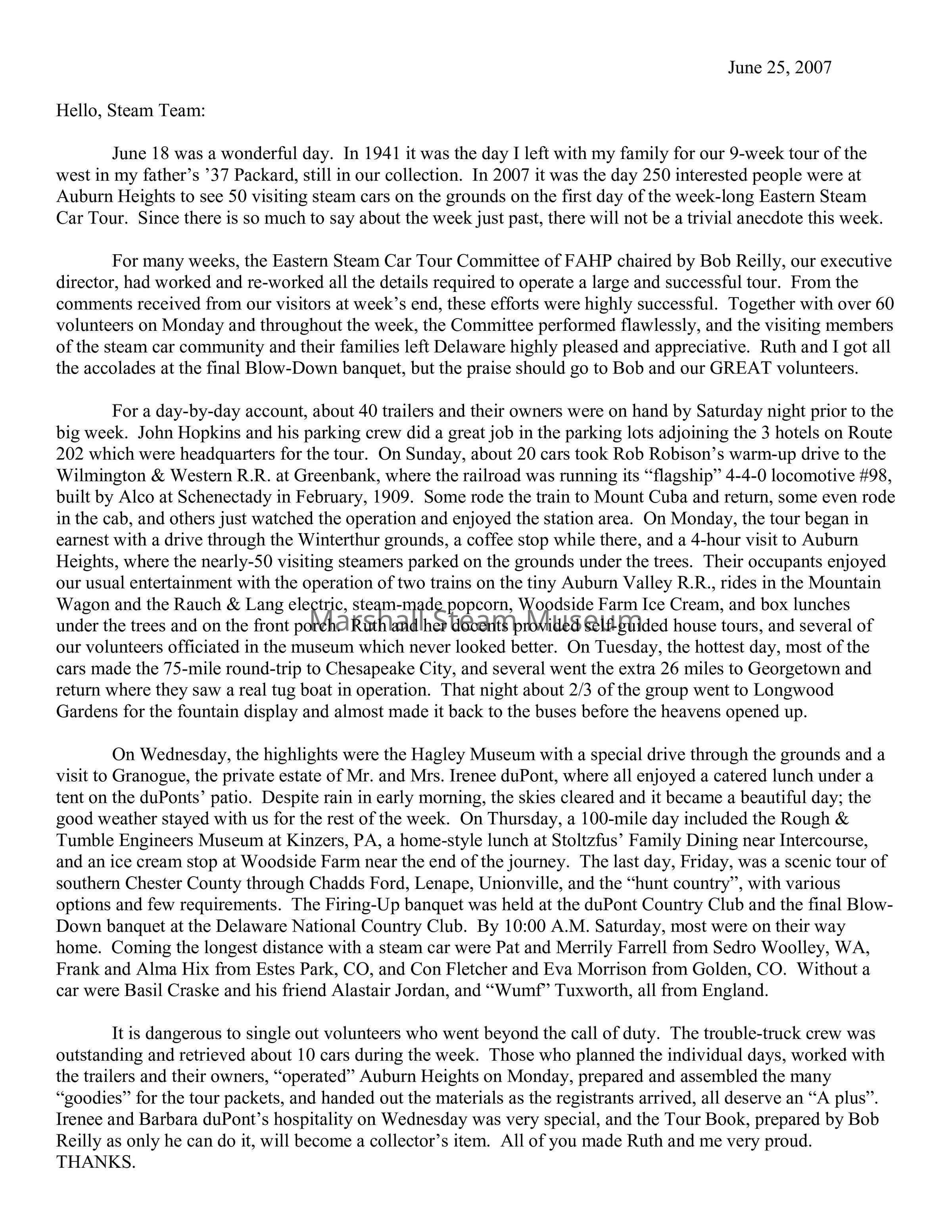 June 18 was a wonderful day. In 1941 it was the day I left with my family for our 9-week tour of the west in my father’s ’37 Packard, still in our collection. In 2007 it was the day 250 interested people were at Auburn Heights to see 50 visiting steam cars on the grounds on the first day of the week-long Eastern Steam Car Tour. Since there is so much to say about the week just past, there will not be a trivial anecdote this week.