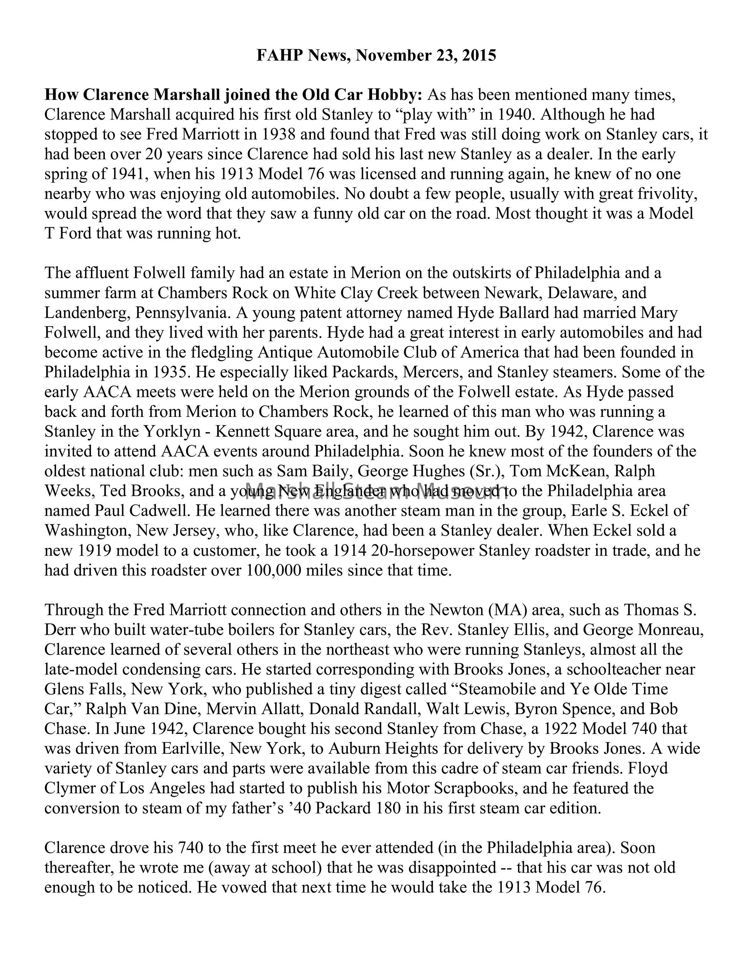 How Clarence Marshall joined the Old Car Hobby: As has been mentioned many times, Clarence Marshall acquired his first old Stanley to “play with” in 1940. Although he had stopped to see Fred Marriott in 1938 and found that Fred was still doing work on Stanley cars, it had been over 20 years since Clarence had sold his last new Stanley as a dealer. In the early spring of 1941, when his 1913 Model 76 was licensed and running again, he knew of no one nearby who was enjoying old automobiles. No doubt a few people, usually with great frivolity, would spread the word that they saw a funny old car on the road. Most thought it was a Model T Ford that was running hot.