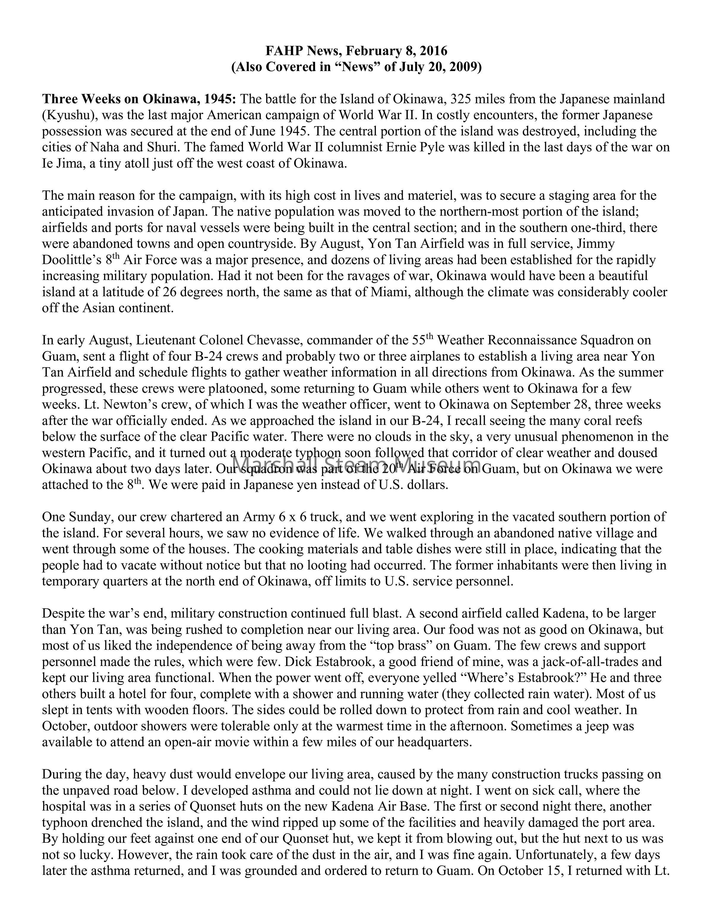 In early August, Lieutenant Colonel Chevasse, commander of the 55th Weather Reconnaissance Squadron on Guam, sent a flight of four B-24 crews and probably two or three airplanes to establish a living area near Yon Tan Airfield and schedule flights to gather weather information in all directions from Okinawa. As the summer progressed, these crews were platooned, some returning to Guam while others went to Okinawa for a few weeks. Lt. Newton’s crew, of which I was the weather officer, went to Okinawa on September 28, three weeks after the war officially ended. As we approached the island in our B-24, I recall seeing the many coral reefs below the surface of the clear Pacific water. There were no clouds in the sky, a very unusual phenomenon in the western Pacific, and it turned out a moderate typhoon soon followed that corridor of clear weather and doused Okinawa about two days later. Our squadron was part of the 20th Air Force on Guam, but on Okinawa we were attached to the 8th. We were paid in Japanese yen instead of U.S. dollars.