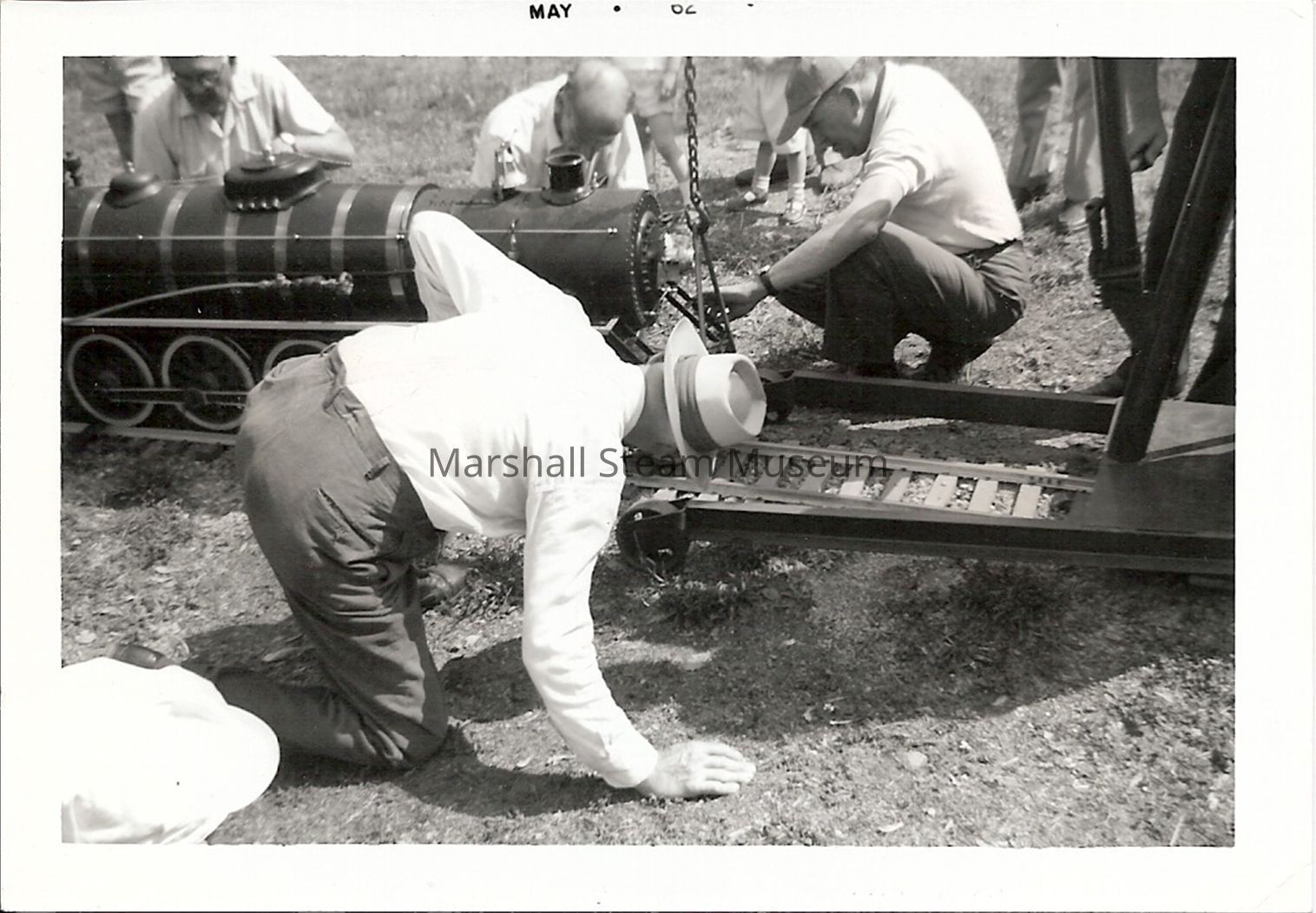 T Clarence Marshall rerailing the 402 on the back curve, 1960