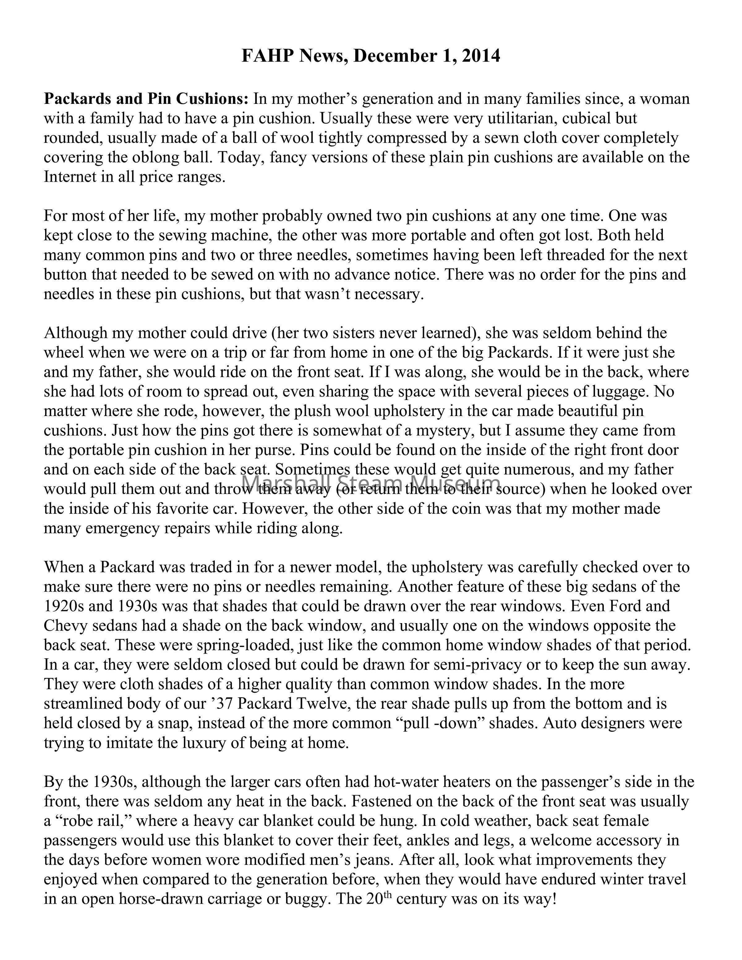 Packards and Pin Cushions: In my mother’s generation and in many families since, a woman with a family had to have a pin cushion. Usually these were very utilitarian, cubical but rounded, usually made of a ball of wool tightly compressed by a sewn cloth cover completely covering the oblong ball. Today, fancy versions of these plain pin cushions are available on the Internet in all price ranges.