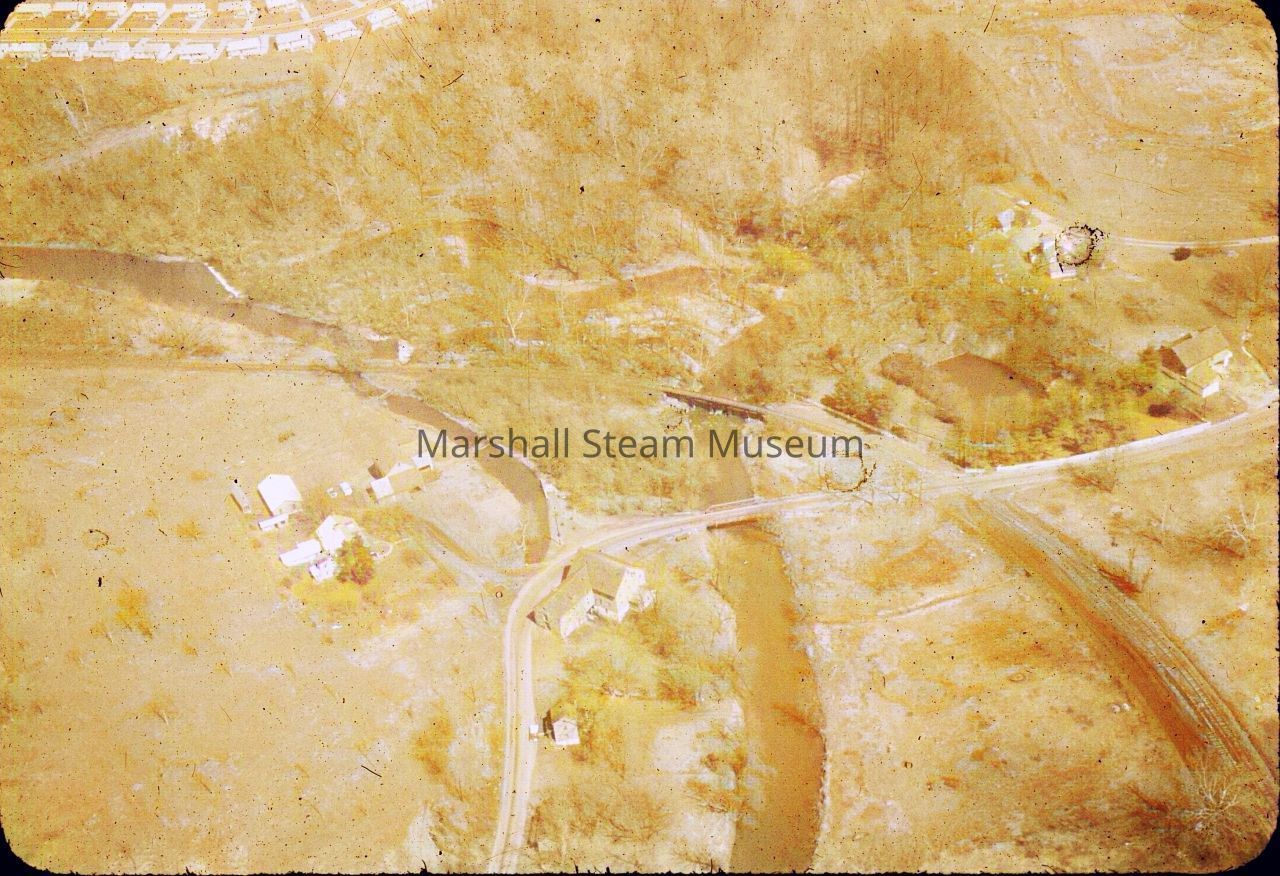 Greenbank Mill and Philips Farm are just below image center. The mill dam on Red Clay Creek is intact and the mill’s head race is full to the mill which suffered an arson fire in 1969. The WWRR tracks run lower right to center left. The open pit filled with water is the old quarry for the New Castle County Workhouse located to the right, out of the image frame. The housing at the upper left is Albertson Park.Photograph Details