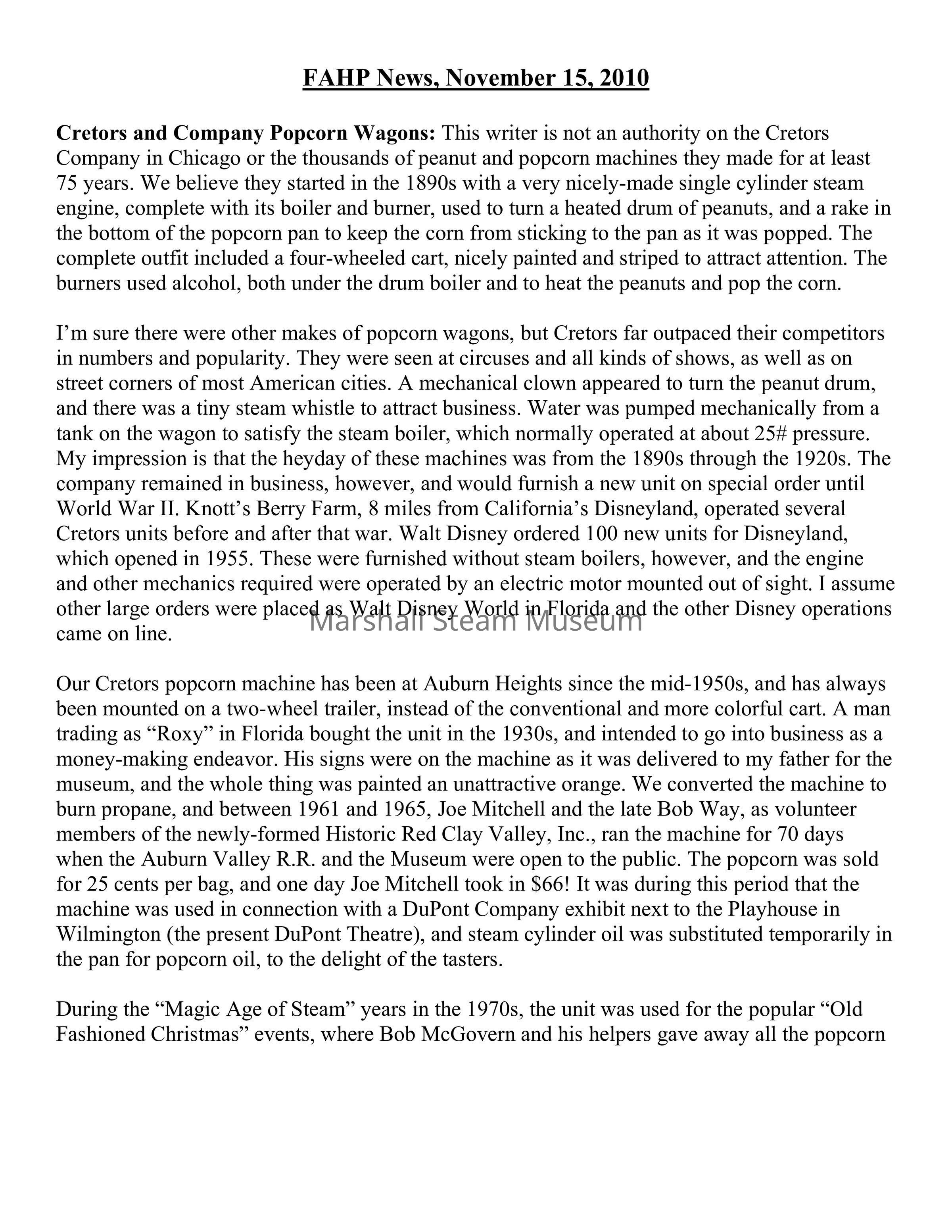 My impression is that the heyday of these machines was from the 1890s through the 1920s. The company remained in business, however, and would furnish a new unit on special order until World War II. Knott’s Berry Farm, 8 miles from California’s Disneyland, operated several Cretors units before and after that war. Walt Disney ordered 100 new units for Disneyland, which opened in 1955. These were furnished without steam boilers, however, and the engine and other mechanics required were operated by an electric motor mounted out of sight. I assume other large orders were placed as Walt Disney World in Florida and the other Disney operations came on line.
