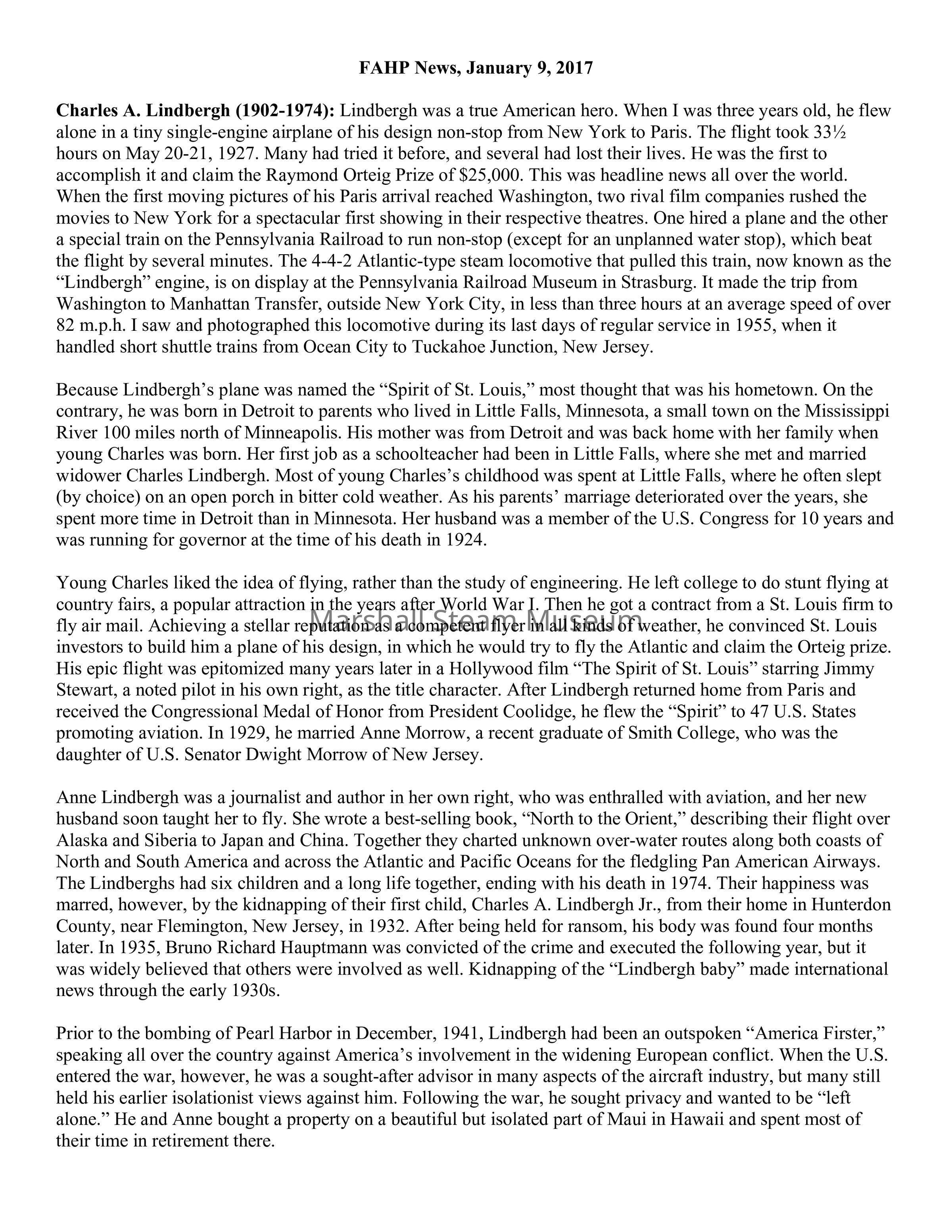 Young Charles liked the idea of flying, rather than the study of engineering. He left college to do stunt flying at country fairs, a popular attraction in the years after World War I. Then he got a contract from a St. Louis firm to fly air mail. Achieving a stellar reputation as a competent flyer in all kinds of weather, he convinced St. Louis investors to build him a plane of his design, in which he would try to fly the Atlantic and claim the Orteig prize. His epic flight was epitomized many years later in a Hollywood film “The Spirit of St. Louis” starring Jimmy Stewart, a noted pilot in his own right, as the title character. After Lindbergh returned home from Paris and received the Congressional Medal of Honor from President Coolidge, he flew the “Spirit” to 47 U.S. States promoting aviation. In 1929, he married Anne Morrow, a recent graduate of Smith College, who was the daughter of U.S. Senator Dwight Morrow of New Jersey.