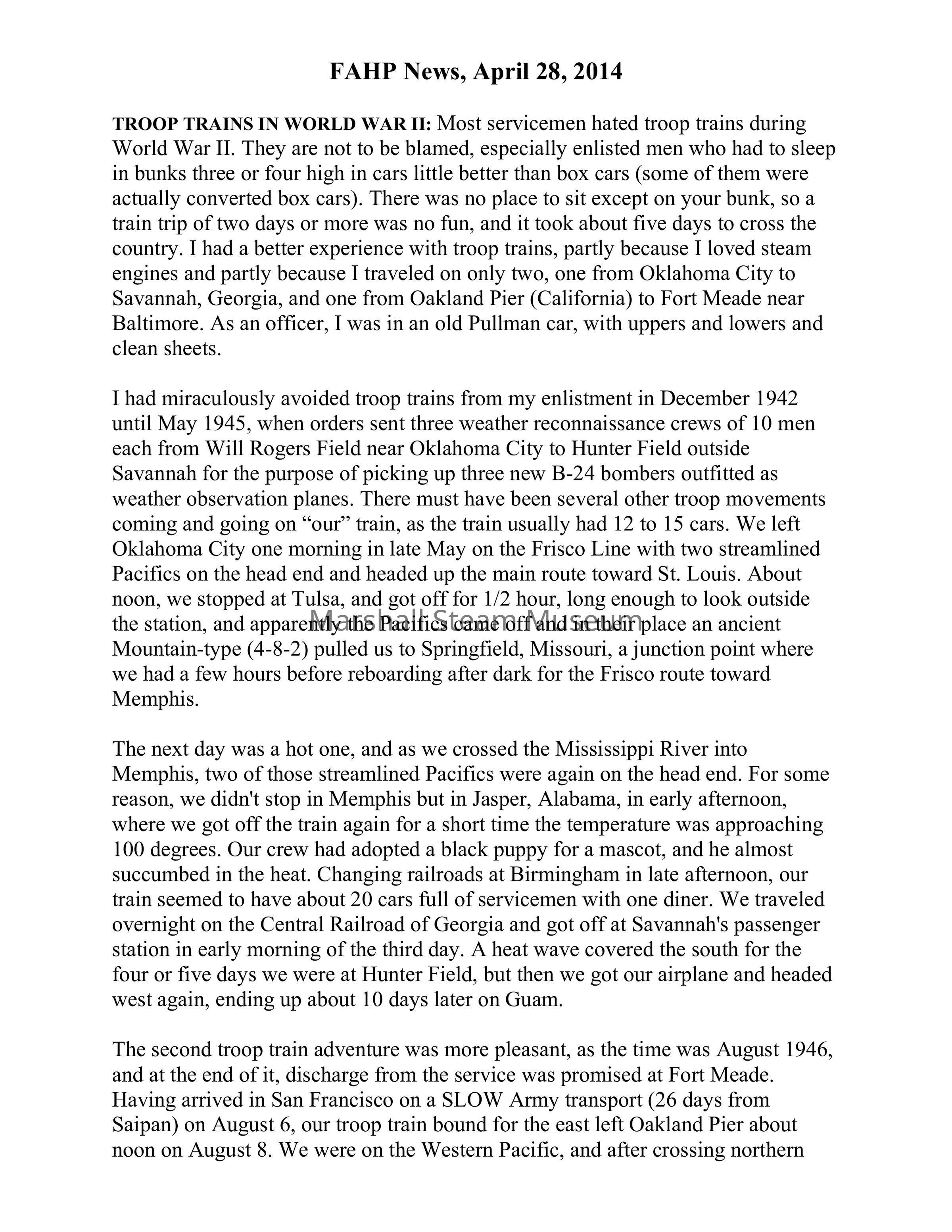 TROOP TRAINS IN WORLD WAR II: Most servicemen hated troop trains during World War II. They are not to be blamed, especially enlisted men who had to sleep in bunks three or four high in cars little better than box cars (some of them were actually converted box cars). There was no place to sit except on your bunk, so a train trip of two days or more was no fun, and it took about five days to cross the country. I had a better experience with troop trains, partly because I loved steam engines and partly because I traveled on only two, one from Oklahoma City to Savannah, Georgia, and one from Oakland Pier (California) to Fort Meade near Baltimore. As an officer, I was in an old Pullman car, with uppers and lowers and clean sheets.