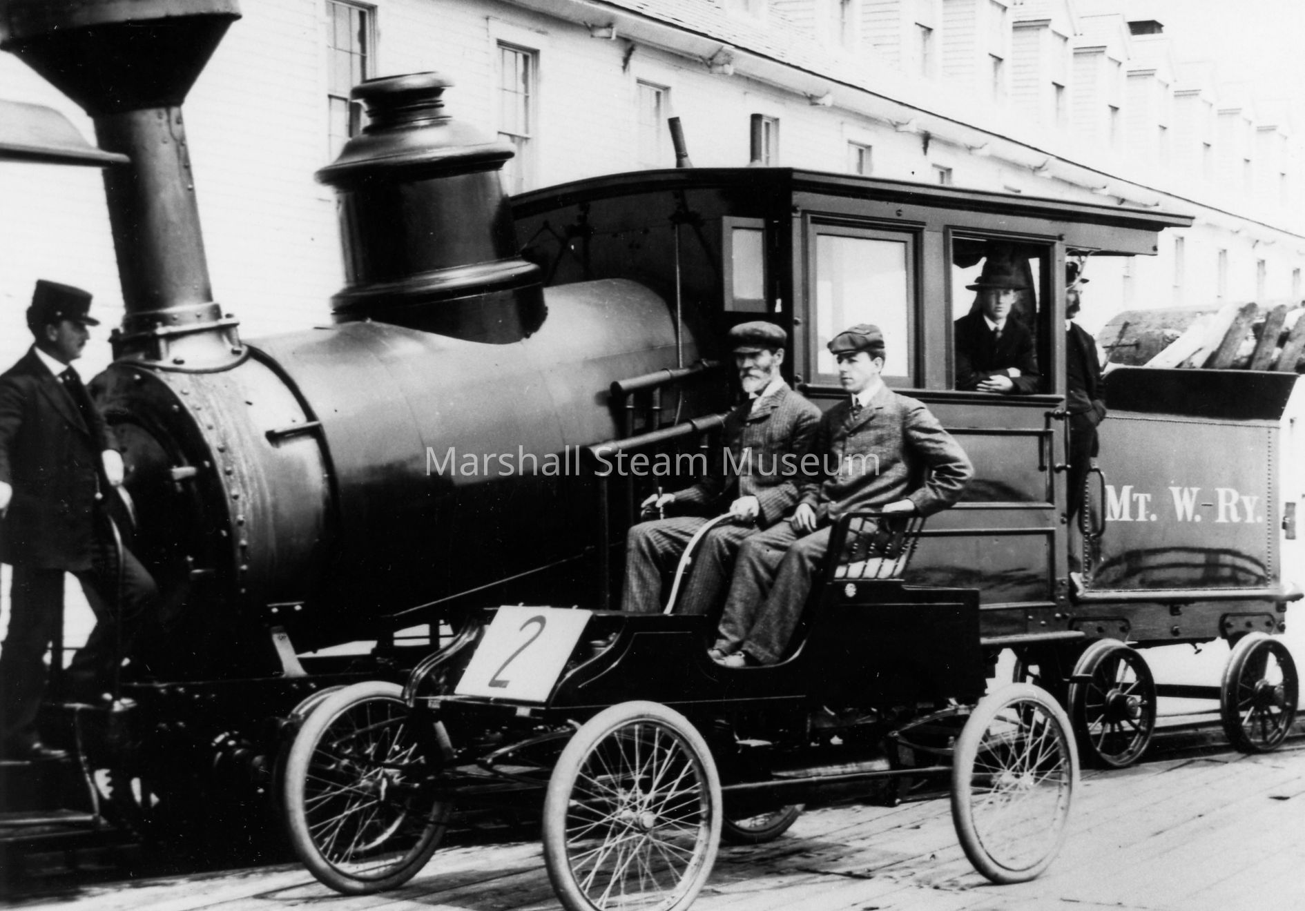 Undated photograph of a 1905 STanley Model BX or CX and a small steam locomotivePhotograph Details