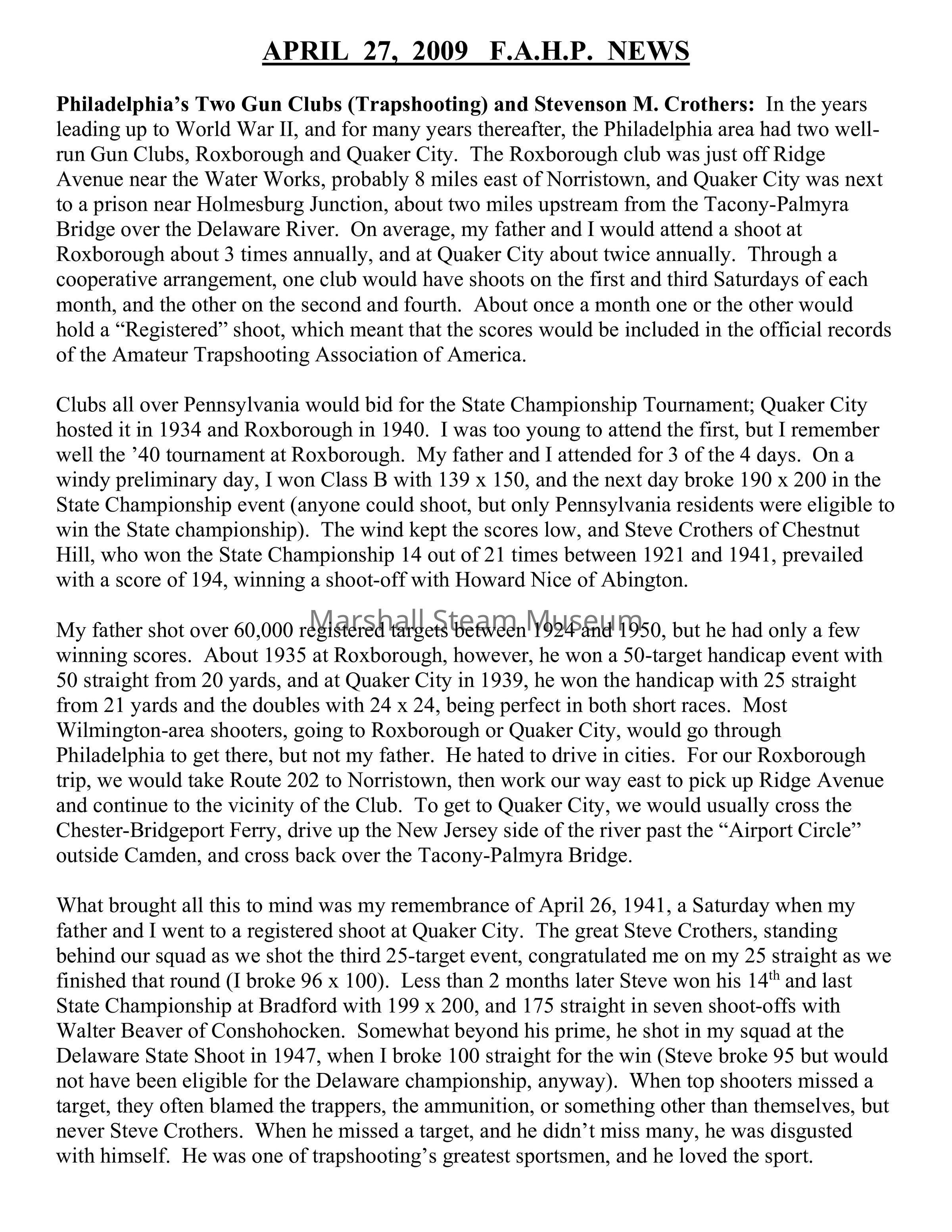 Philadelphia’s Two Gun Clubs (Trapshooting) and Stevenson M. Crothers: In the years leading up to World War II, and for many years thereafter, the Philadelphia area had two well-run Gun Clubs, Roxborough and Quaker City. The Roxborough club was just off Ridge Avenue near the Water Works, probably 8 miles east of Norristown, and Quaker City was next to a prison near Holmesburg Junction, about two miles upstream from the Tacony-Palmyra Bridge over the Delaware River. On average, my father and I would attend a shoot at Roxborough about 3 times annually, and at Quaker City about twice annually. Through a cooperative arrangement, one club would have shoots on the first and third Saturdays of each month, and the other on the second and fourth. About once a month one or the other would hold a “Registered” shoot, which meant that the scores would be included in the official records of the Amateur Trapshooting Association of America.