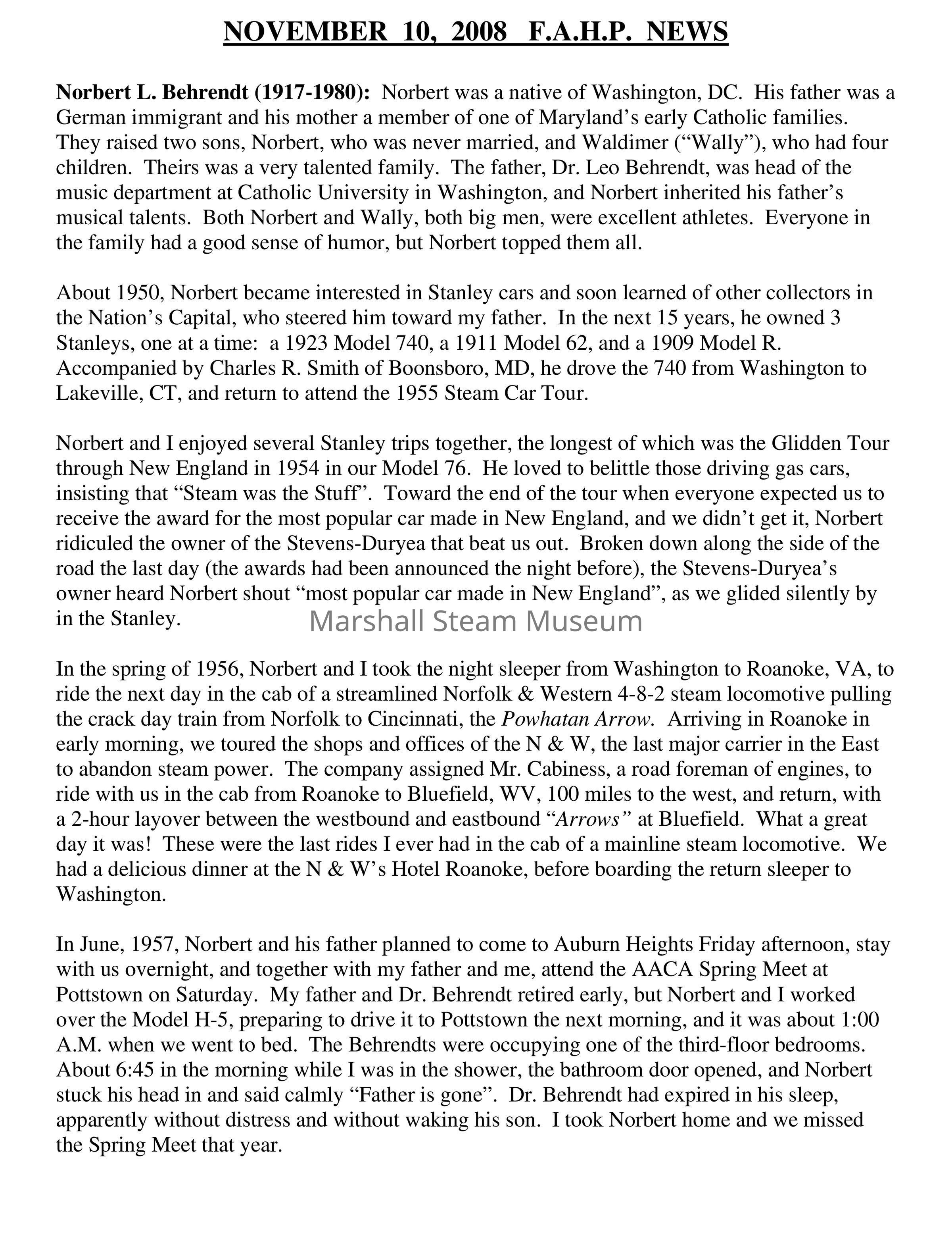 Very soon thereafter, Norbert and his mother moved out of the District of Columbia, and bought a small but nice home in the horse country around Ashton, MD. Mrs. Behrendt died in 1966, and Norbert sold that place and bought several acres of farmland with a modern house near Highland, MD. Living alone, he changed his primary hobby from Stanley cars to Shire horses, and he raised several of them on his new farm. I visited several times and he came to Yorklyn occasionally. Without his mother’s cooking and never wanting to see a doctor, he passed away too soon, in 1980 at the age of 62.