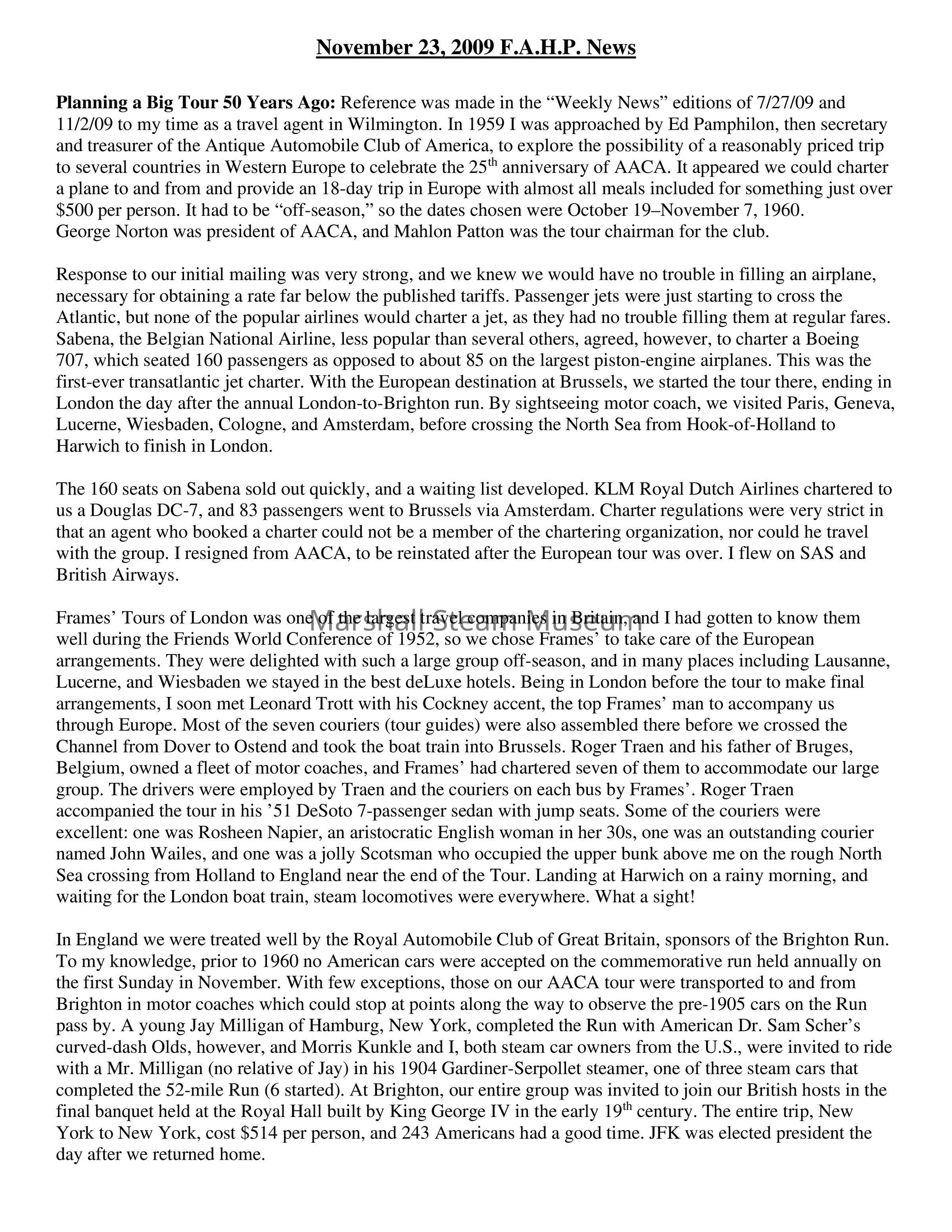 Planning a Big Tour 50 Years Ago: Reference was made in the “Weekly News” editions of 7/27/09 and 11/2/09 to my time as a travel agent in Wilmington. In 1959 I was approached by Ed Pamphilon, then secretary and treasurer of the Antique Automobile Club of America, to explore the possibility of a reasonably priced trip to several countries in Western Europe to celebrate the 25th anniversary of AACA. It appeared we could charter a plane to and from and provide an 18-day trip in Europe with almost all meals included for something just over $500 per person. It had to be “off-season,” so the dates chosen were October 19–November 7, 1960.