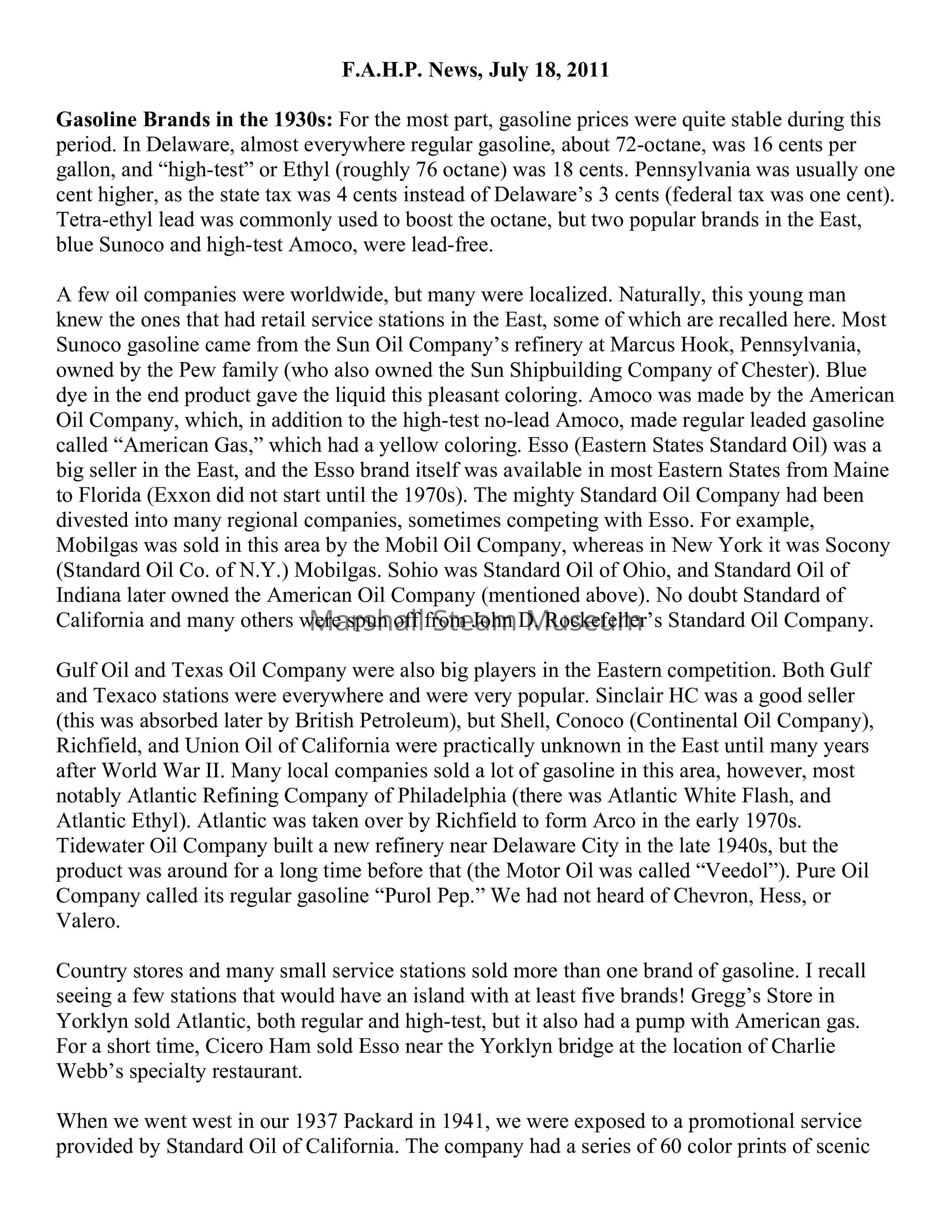 Gasoline Brands in the 1930s: For the most part, gasoline prices were quite stable during this period. In Delaware, almost everywhere regular gasoline, about 72-octane, was 16 cents per gallon, and “high-test” or Ethyl (roughly 76 octane) was 18 cents. Pennsylvania was usually one cent higher, as the state tax was 4 cents instead of Delaware’s 3 cents (federal tax was one cent). Tetra-ethyl lead was commonly used to boost the octane, but two popular brands in the East, blue Sunoco and high-test Amoco, were lead-free.