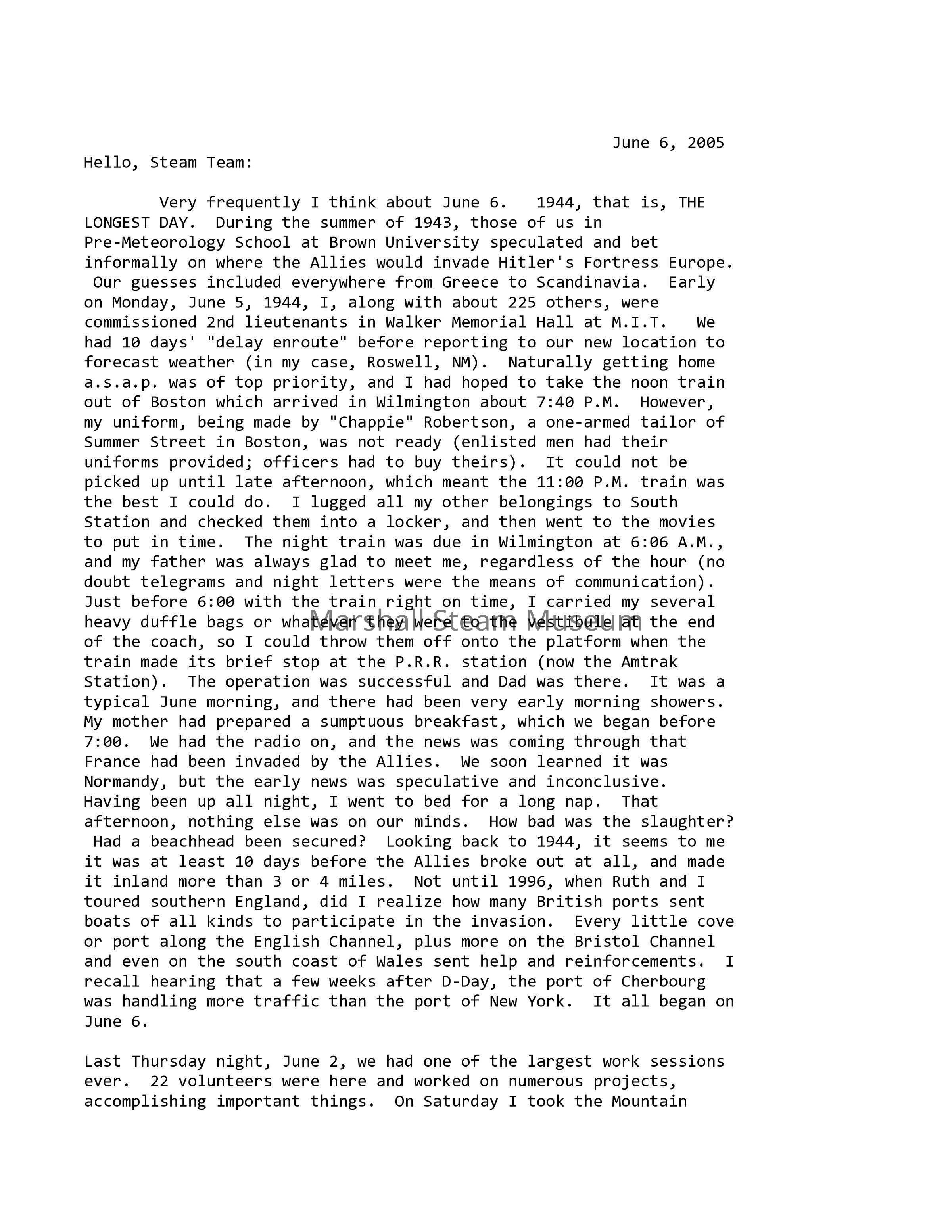Very frequently I think about June 6,1944, that is, THE LONGEST DAY. During the summer of 1943, those of us in Pre-Meteorology School at Brown University speculated and bet informally on where the Allies would invade Hitler's Fortress Europe. Our guesses included everywhere from Greece to Scandinavia. Early on Monday, June 5, 1944, I, along with about 225 others, were commissioned 2nd lieutenants in Walker Memorial Hall at M.I.T. We had 10 days' "delay enroute" before reporting to our new location to forecast weather (in my case, Roswell, NM). Naturally getting home a.s.a.p. was of top priority, and I had hoped to take the noon train out of Boston which arrived in Wilmington about 7:40 P.M. However, my uniform, being made by "Chappie" Robertson, a one-armed tailor of Summer Street in Boston, was not ready (enlisted men had their uniforms provided; officers had to buy theirs). It could not be picked up until late afternoon, which meant the 11:00 P.M. train was the best I could do. I lugged all my other belongings to South Station and checked them into a locker, and then went to the movies to put in time. The night train was due in Wilmington at 6:06 A.M., and my father was always glad to meet me, regardless of the hour (no doubt telegrams and night letters were the means of communication). Just before 6:00 with the train right on time, I carried my several heavy duffle bags or whatever they were to the vestibule at the end of the coach, so I could throw them off onto the platform when the train made its brief stop at the P.R.R. station (now the Amtrak Station). The operation was successful and Dad was there. It was a typical June morning, and there had been very early morning showers. My mother had prepared a sumptuous breakfast, which we began before 7:00. We had the radio on, and the news was coming through that France had been invaded by the Allies. We soon learned it was Normandy, but the early news was speculative and inconclusive. Having been up all night, I went to bed for a long nap. That afternoon, nothing else was on our minds. How bad was the slaughter? Had a beachhead been secured? Looking back to 1944, it seems to me it was at least 10 days before the Allies broke out at all, and made it inland more than 3 or 4 miles. Not until 1996, when Ruth and I toured southern England, did I realize how many British ports sent boats of all kinds to participate in the invasion. Every little cove or port along the English Channel, plus more on the Bristol Channel and even on the south coast of Wales sent help and reinforcements. I recall hearing that a few weeks after D-Day, the port of Cherbourg was handling more traffic than the port of New York. It all began on June 6.