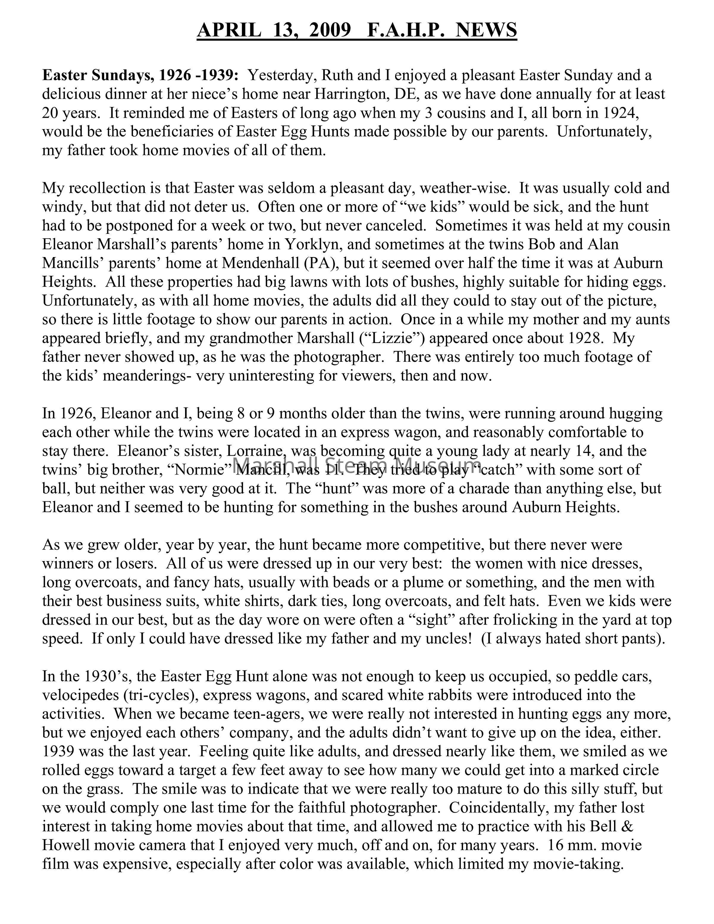 Easter Sundays, 1926 -1939: Yesterday, Ruth and I enjoyed a pleasant Easter Sunday and a delicious dinner at her niece’s home near Harrington, DE, as we have done annually for at least 20 years. It reminded me of Easters of long ago when my 3 cousins and I, all born in 1924, would be the beneficiaries of Easter Egg Hunts made possible by our parents. Unfortunately, my father took home movies of all of them.