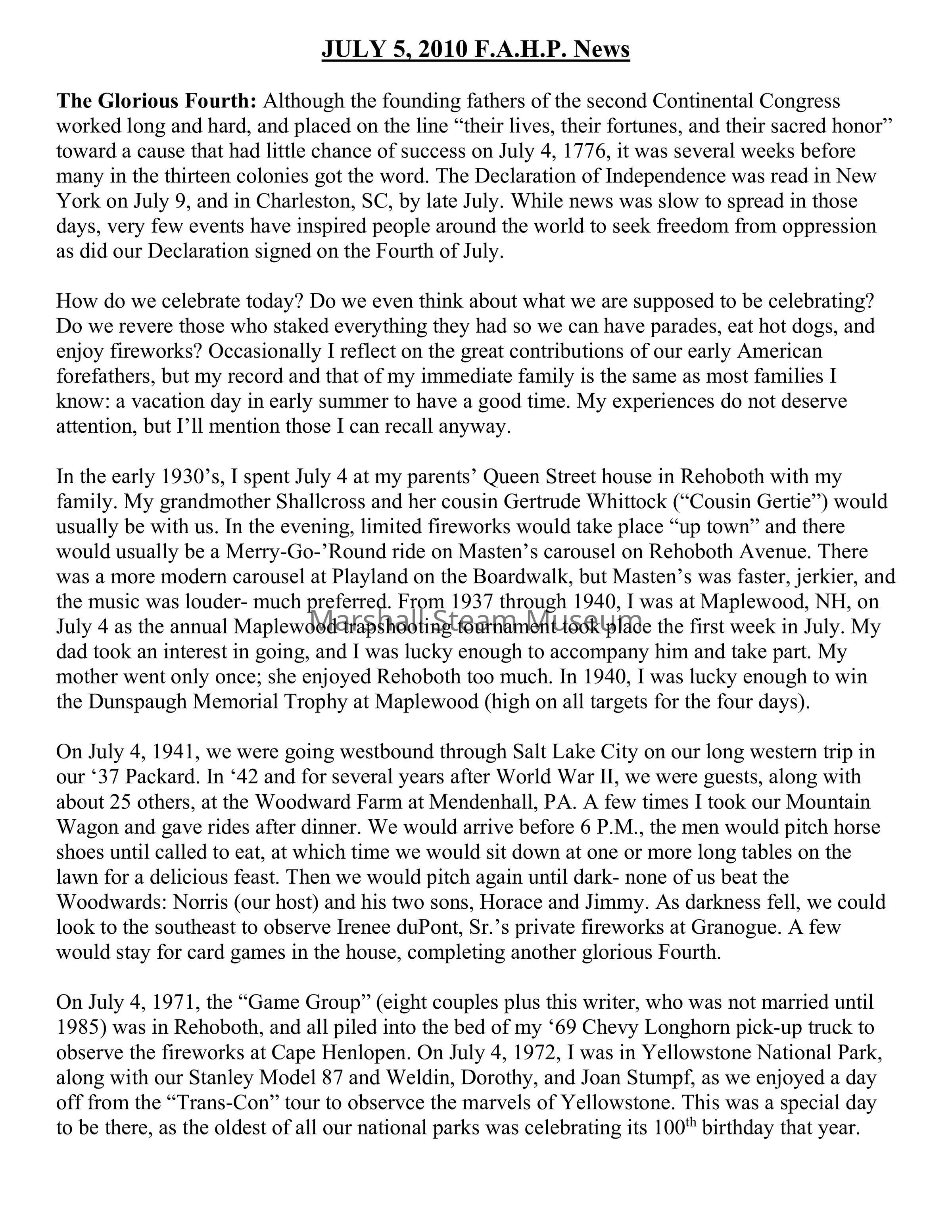 In the early 1930’s, I spent July 4 at my parents’ Queen Street house in Rehoboth with my family. My grandmother Shallcross and her cousin Gertrude Whittock (“Cousin Gertie”) would usually be with us. In the evening, limited fireworks would take place “up town” and there would usually be a Merry-Go-’Round ride on Masten’s carousel on Rehoboth Avenue. There was a more modern carousel at Playland on the Boardwalk, but Masten’s was faster, jerkier, and the music was louder- much preferred. From 1937 through 1940, I was at Maplewood, NH, on July 4 as the annual Maplewood trapshooting tournament took place the first week in July. My dad took an interest in going, and I was lucky enough to accompany him and take part. My mother went only once; she enjoyed Rehoboth too much. In 1940, I was lucky enough to win the Dunspaugh Memorial Trophy at Maplewood (high on all targets for the four days).
