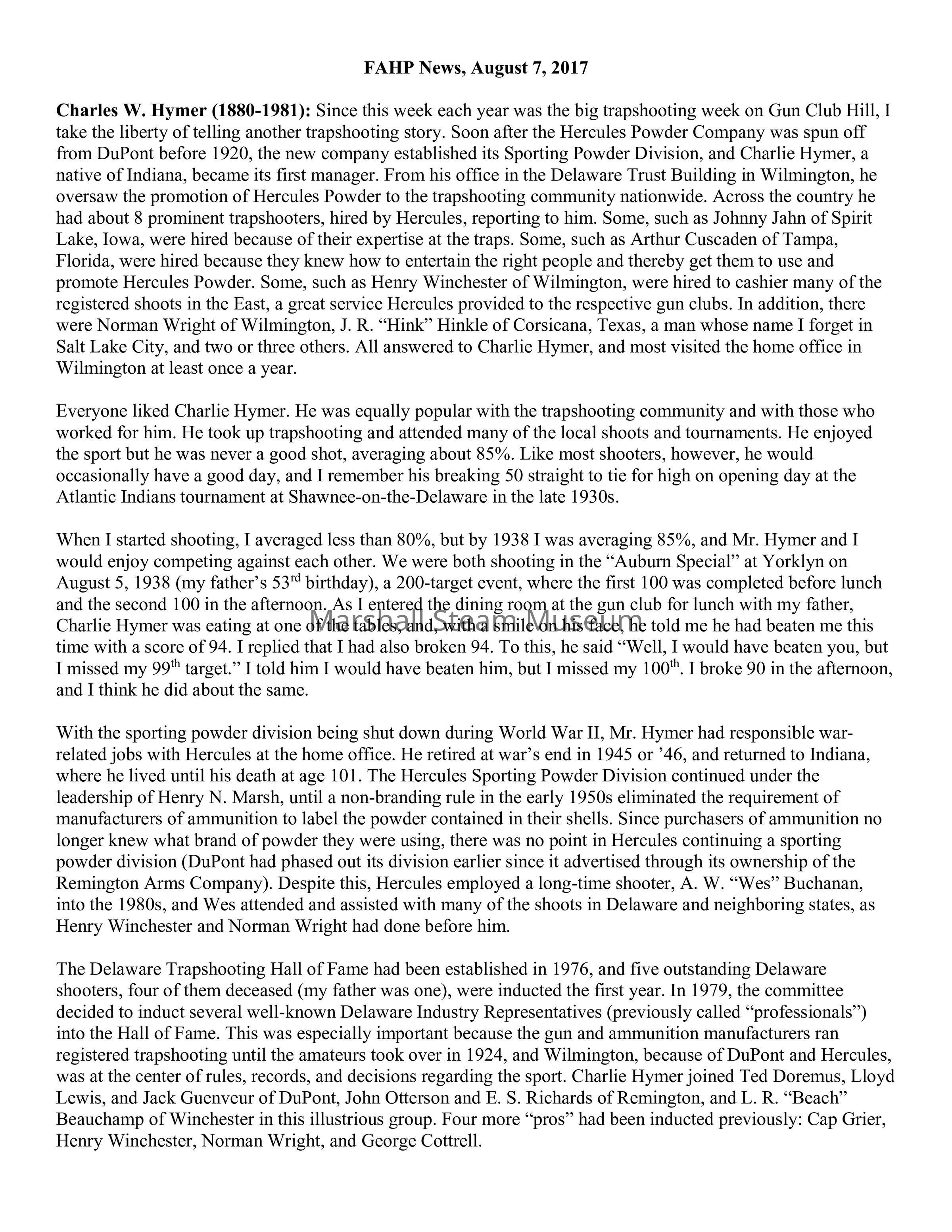 Charles W. Hymer (1880-1981): Since this week each year was the big trapshooting week on Gun Club Hill, I take the liberty of telling another trapshooting story. Soon after the Hercules Powder Company was spun off from DuPont before 1920, the new company established its Sporting Powder Division, and Charlie Hymer, a native of Indiana, became its first manager. From his office in the Delaware Trust Building in Wilmington, he oversaw the promotion of Hercules Powder to the trapshooting community nationwide. Across the country he had about 8 prominent trapshooters, hired by Hercules, reporting to him. Some, such as Johnny Jahn of Spirit Lake, Iowa, were hired because of their expertise at the traps. Some, such as Arthur Cuscaden of Tampa, Florida, were hired because they knew how to entertain the right people and thereby get them to use and promote Hercules Powder. Some, such as Henry Winchester of Wilmington, were hired to cashier many of the registered shoots in the East, a great service Hercules provided to the respective gun clubs. In addition, there were Norman Wright of Wilmington, J. R. “Hink” Hinkle of Corsicana, Texas, a man whose name I forget in Salt Lake City, and two or three others. All answered to Charlie Hymer, and most visited the home office in Wilmington at least once a year.
