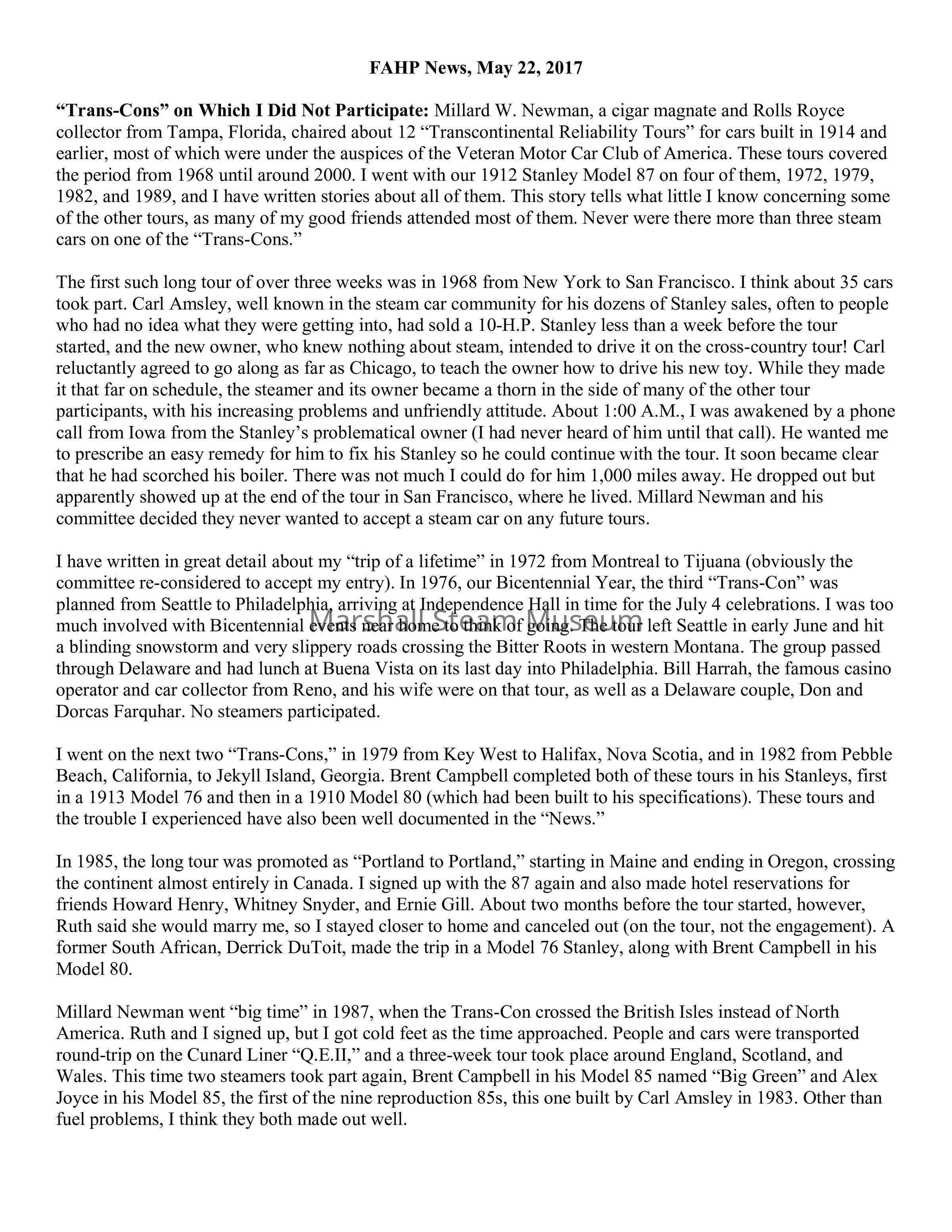 “Trans-Cons” on Which I Did Not Participate: Millard W. Newman, a cigar magnate and Rolls Royce collector from Tampa, Florida, chaired about 12 “Transcontinental Reliability Tours” for cars built in 1914 and earlier, most of which were under the auspices of the Veteran Motor Car Club of America. These tours covered the period from 1968 until around 2000. I went with our 1912 Stanley Model 87 on four of them, 1972, 1979, 1982, and 1989, and I have written stories about all of them. This story tells what little I know concerning some of the other tours, as many of my good friends attended most of them. Never were there more than three steam cars on one of the “Trans-Cons.”
