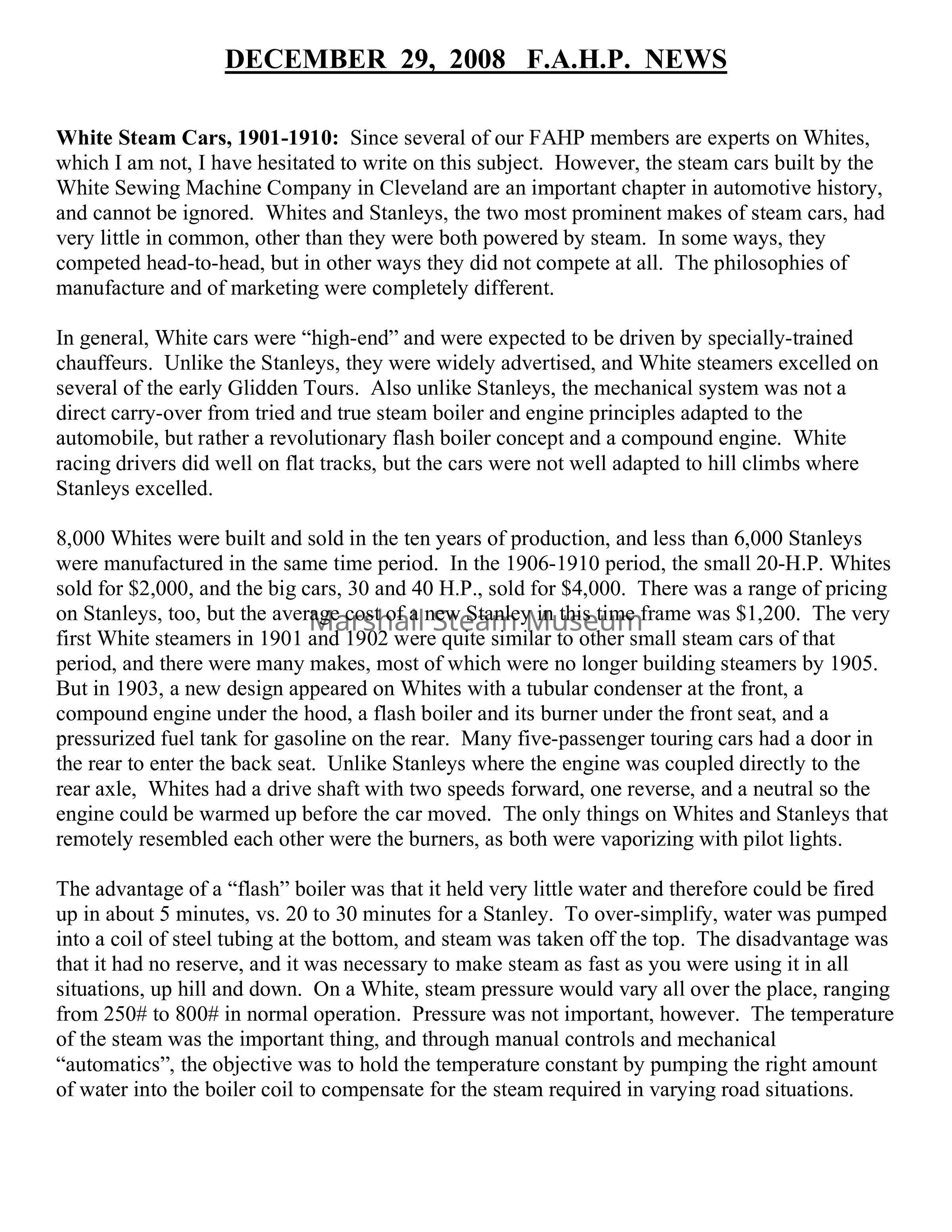 White Steam Cars, 1901-1910: Since several of our FAHP members are experts on Whites, which I am not, I have hesitated to write on this subject. However, the steam cars built by the White Sewing Machine Company in Cleveland are an important chapter in automotive history, and cannot be ignored. Whites and Stanleys, the two most prominent makes of steam cars, had very little in common, other than they were both powered by steam. In some ways, they competed head-to-head, but in other ways they did not compete at all. The philosophies of manufacture and of marketing were completely different.