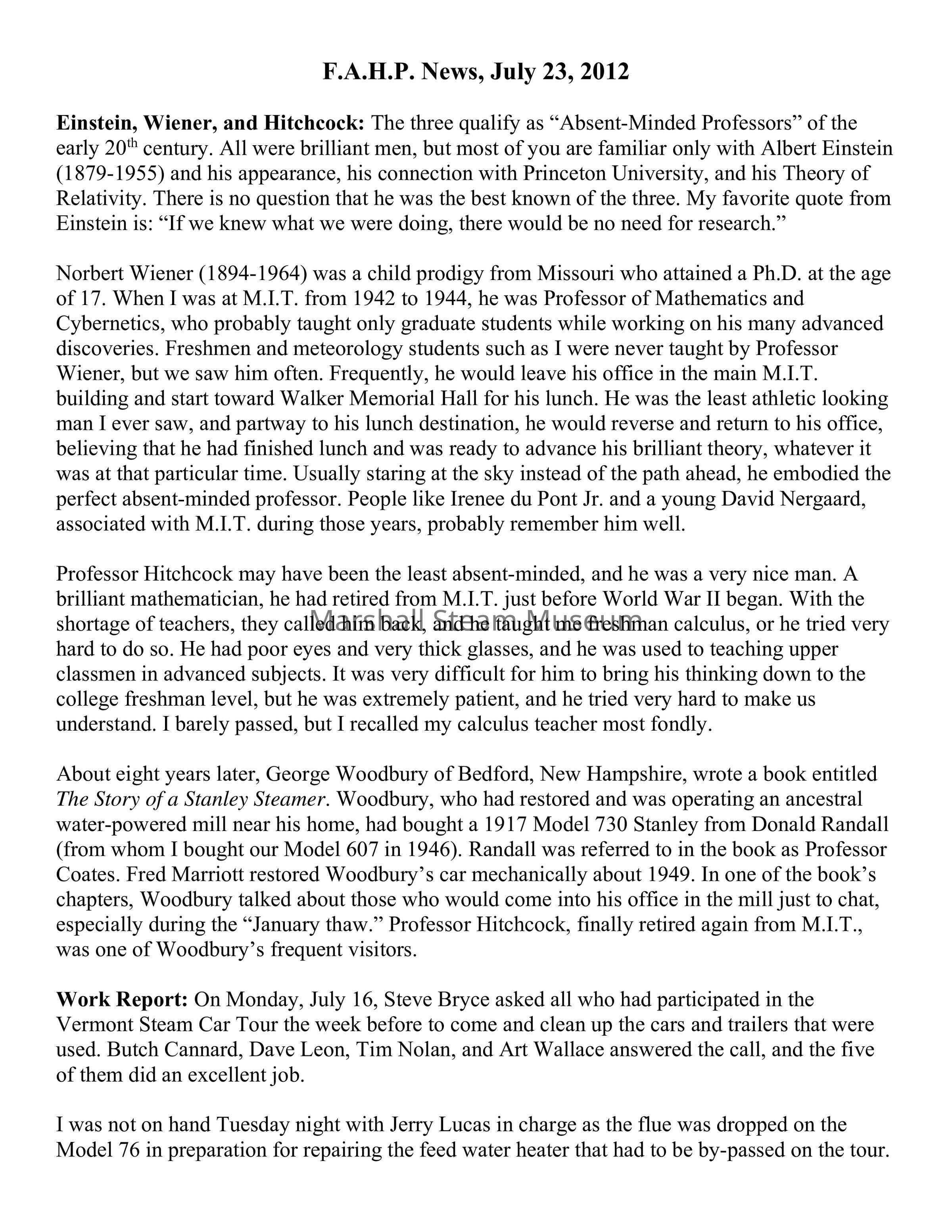 About eight years later, George Woodbury of Bedford, New Hampshire, wrote a book entitled The Story of a Stanley Steamer. Woodbury, who had restored and was operating an ancestral water-powered mill near his home, had bought a 1917 Model 730 Stanley from Donald Randall (from whom I bought our Model 607 in 1946). Randall was referred to in the book as Professor Coates. Fred Marriott restored Woodbury’s car mechanically about 1949. In one of the book’s chapters, Woodbury talked about those who would come into his office in the mill just to chat, especially during the “January thaw.” Professor Hitchcock, finally retired again from M.I.T., was one of Woodbury’s frequent visitors.