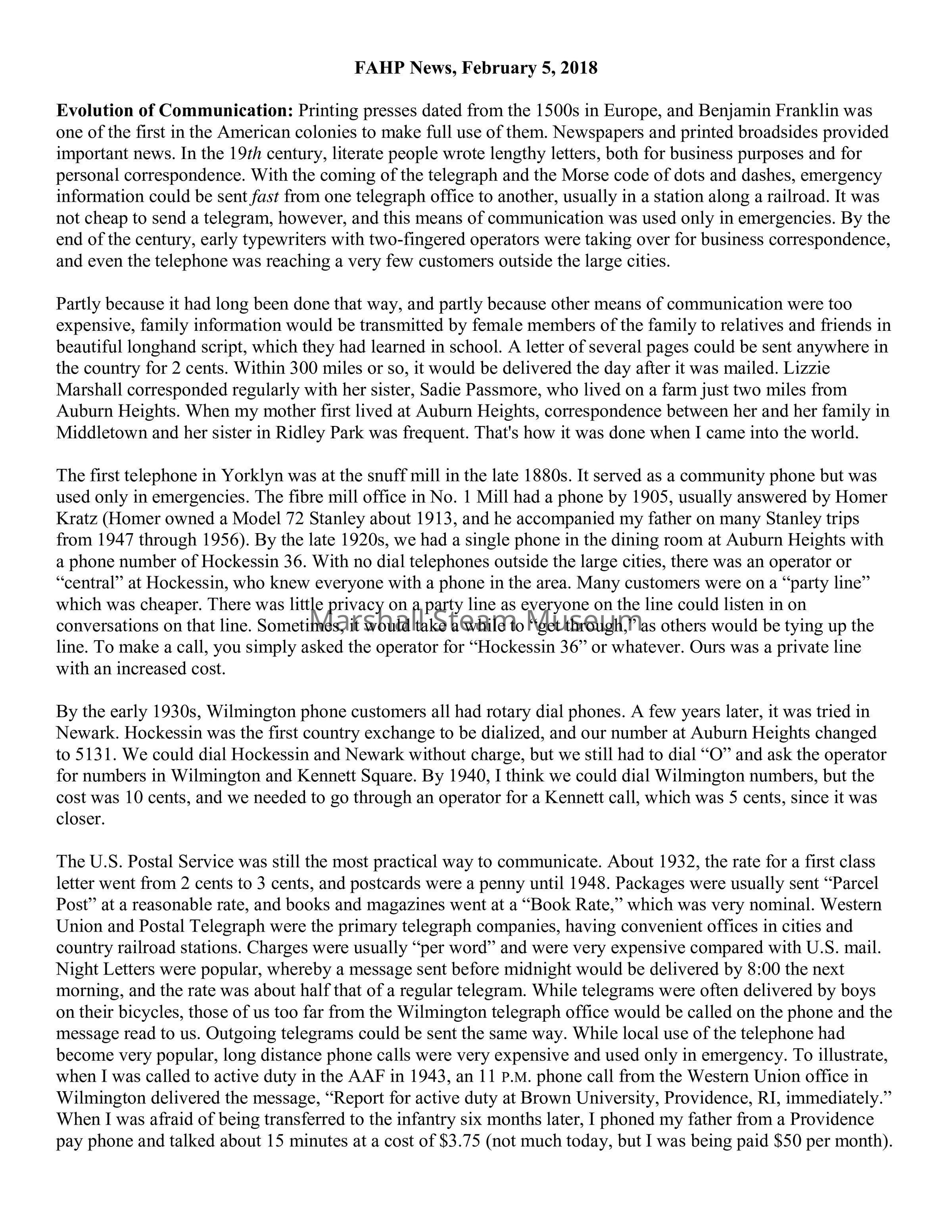 There will be no session on Tuesday, February 6, because of the Annual Meeting of FAHP. It will be held at the Hockessin United Methodist Church on Route 41 at 7:00, with refreshments at 6:30. We hope you can attend.