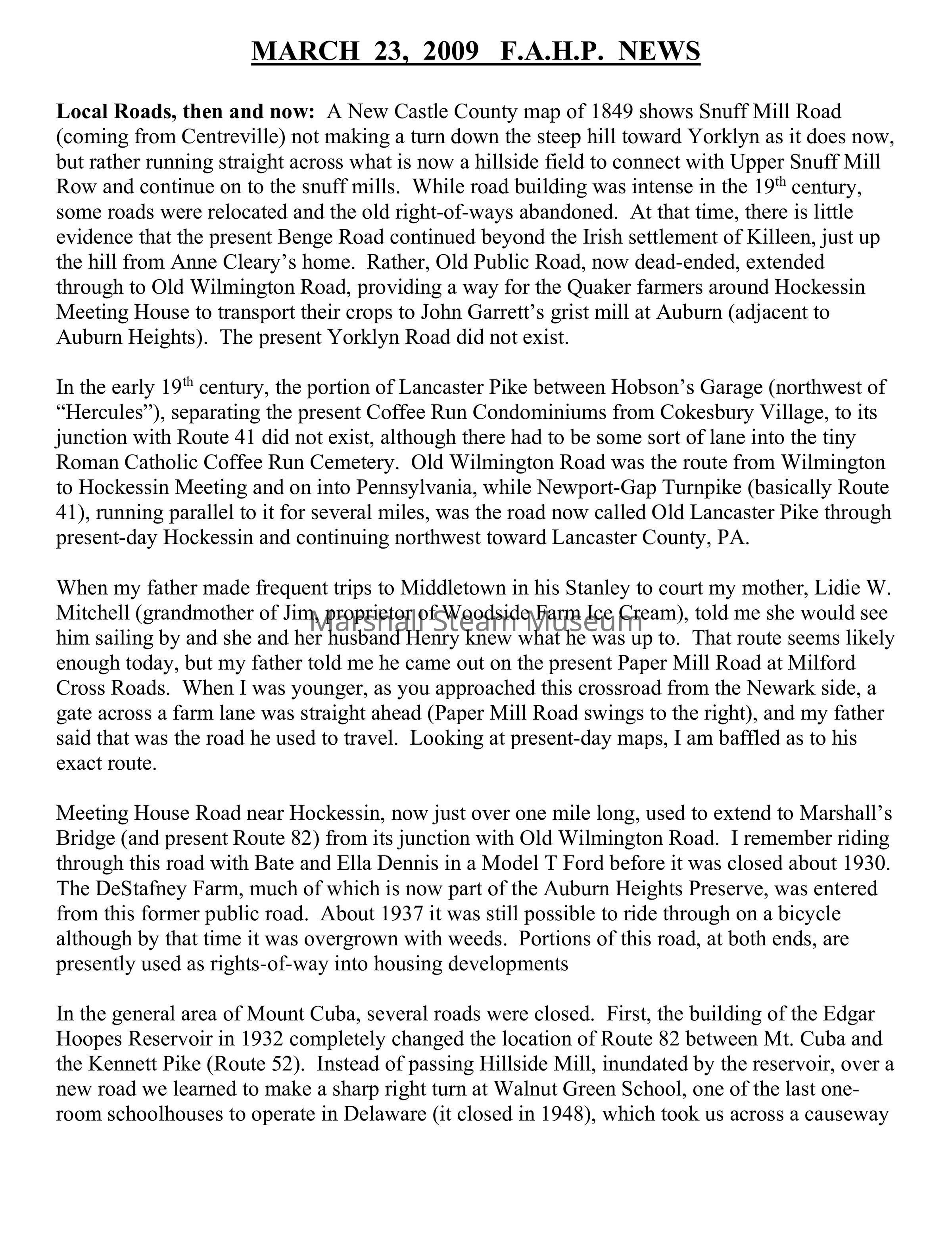When my father made frequent trips to Middletown in his Stanley to court my mother, Lidie W. Mitchell (grandmother of Jim, proprietor of Woodside Farm Ice Cream), told me she would see him sailing by and she and her husband Henry knew what he was up to. That route seems likely enough today, but my father told me he came out on the present Paper Mill Road at Milford Cross Roads. When I was younger, as you approached this crossroad from the Newark side, a gate across a farm lane was straight ahead (Paper Mill Road swings to the right), and my father said that was the road he used to travel. Looking at present-day maps, I am baffled as to his exact route.