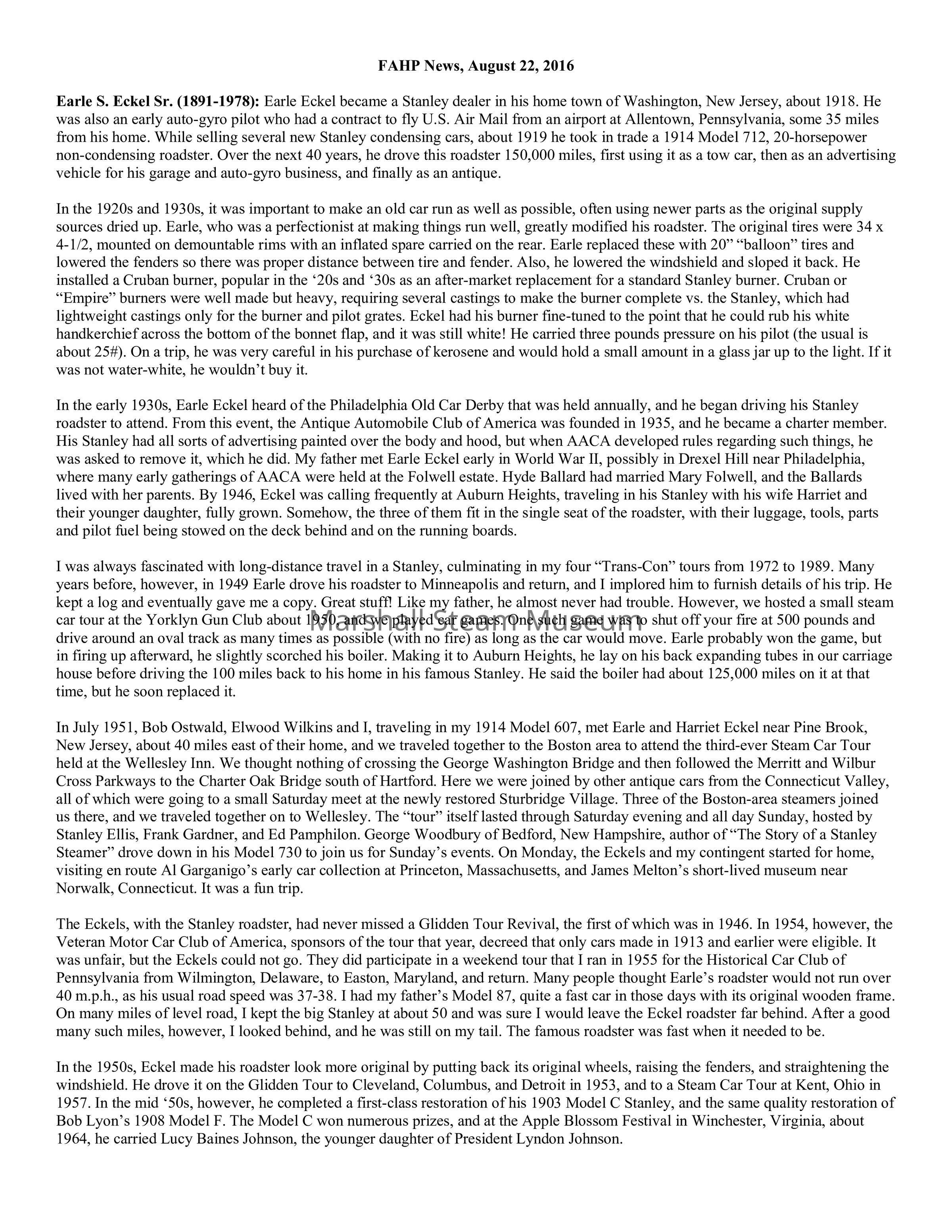 Earle S. Eckel Sr. (1891-1978): Earle Eckel became a Stanley dealer in his home town of Washington, New Jersey, about 1918. He was also an early auto-gyro pilot who had a contract to fly U.S. Air Mail from an airport at Allentown, Pennsylvania, some 35 miles from his home. While selling several new Stanley condensing cars, about 1919 he took in trade a 1914 Model 712, 20-horsepower non-condensing roadster. Over the next 40 years, he drove this roadster 150,000 miles, first using it as a tow car, then as an advertising vehicle for his garage and auto-gyro business, and finally as an antique.