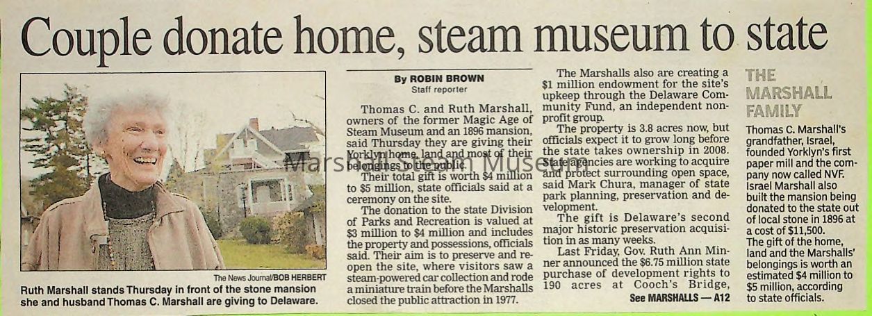 Article from The News Journal regarding the donation of the Auburn Heights mansion and the Marshall STeam Museum to the State of Delaware
