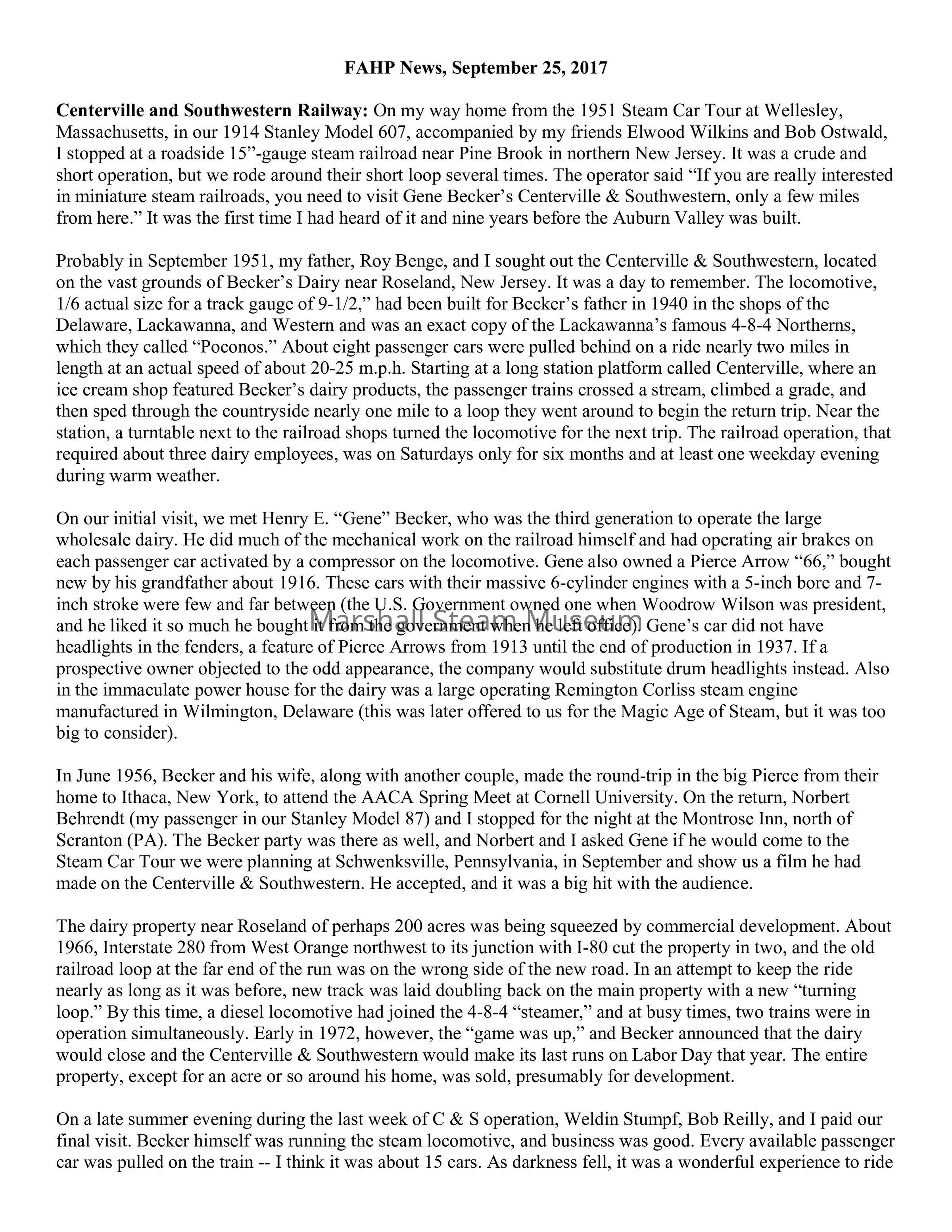 Centerville and Southwestern Railway: On my way home from the 1951 Steam Car Tour at Wellesley, Massachusetts, in our 1914 Stanley Model 607, accompanied by my friends Elwood Wilkins and Bob Ostwald, I stopped at a roadside 15”-gauge steam railroad near Pine Brook in northern New Jersey. It was a crude and short operation, but we rode around their short loop several times. The operator said “If you are really interested in miniature steam railroads, you need to visit Gene Becker’s Centerville & Southwestern, only a few miles from here.” It was the first time I had heard of it and nine years before the Auburn Valley was built.