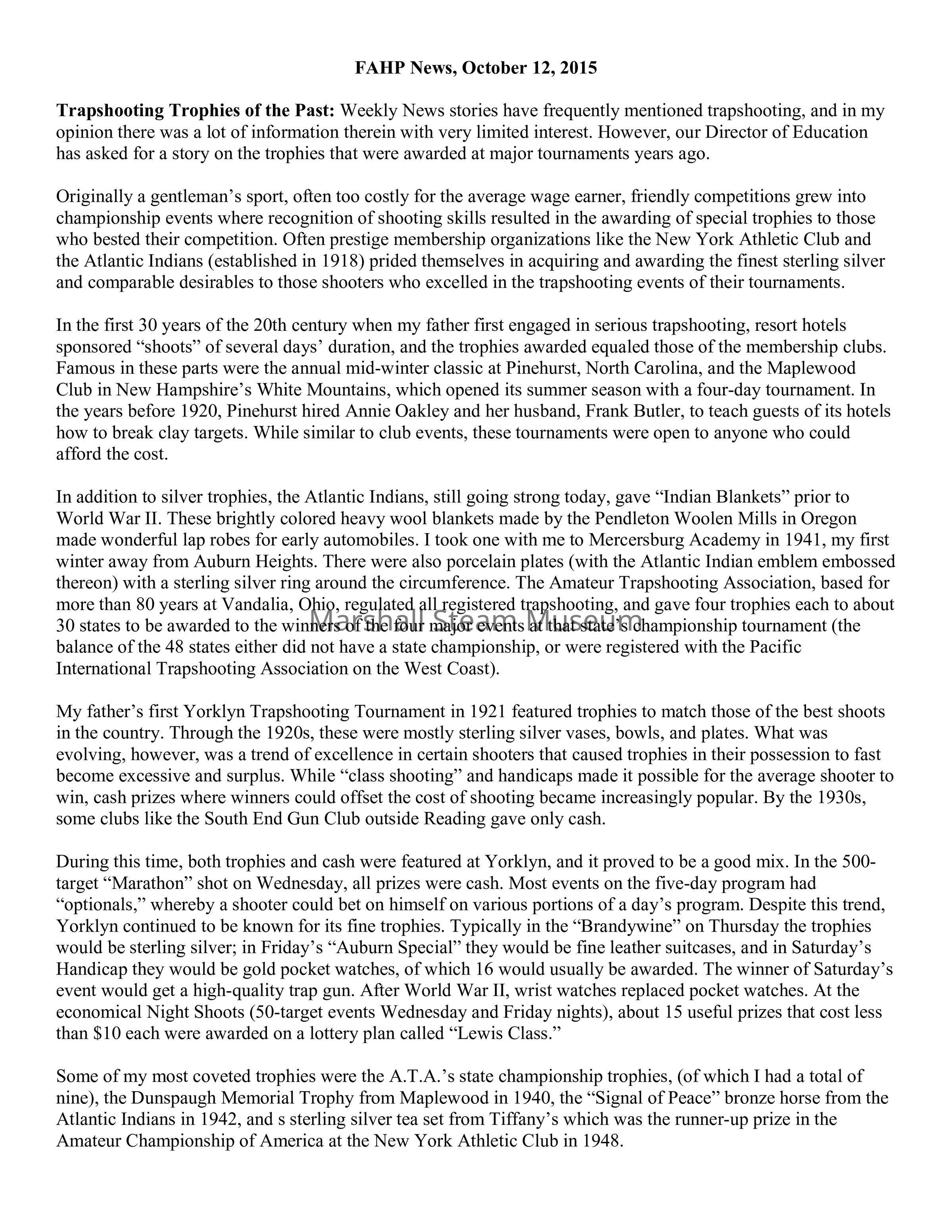 Trapshooting Trophies of the Past: Weekly News stories have frequently mentioned trapshooting, and in my opinion there was a lot of information therein with very limited interest. However, our Director of Education has asked for a story on the trophies that were awarded at major tournaments years ago.