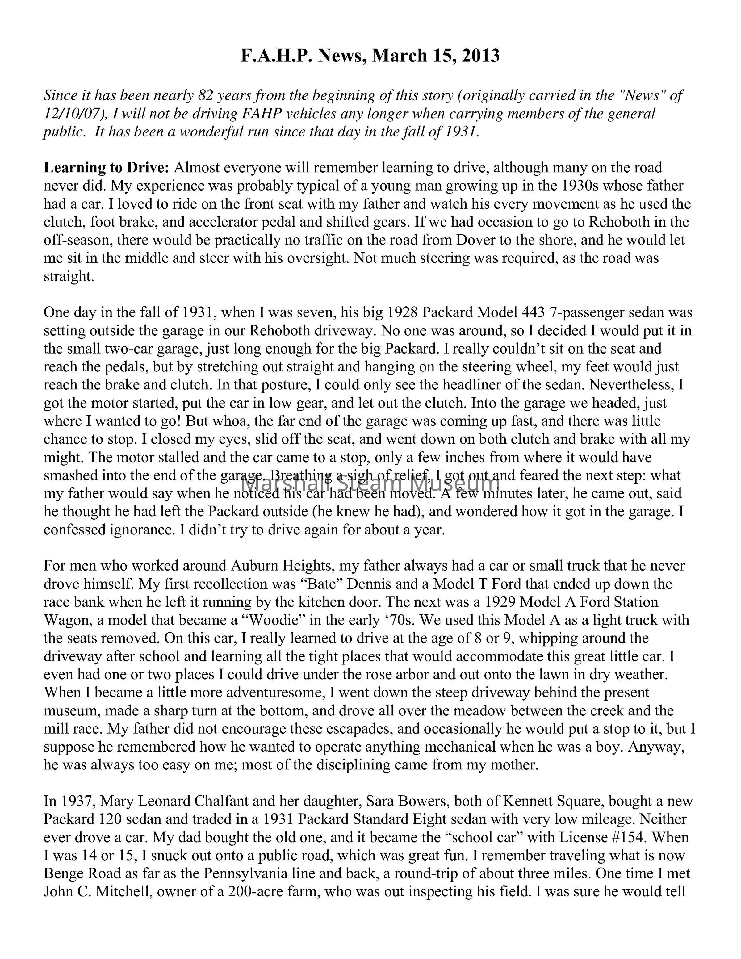 Since it has been nearly 82 years from the beginning of this story (originally carried in the "News" of 12/10/07), I will not be driving FAHP vehicles any longer when carrying members of the general public. It has been a wonderful run since that day in the fall of 1931.