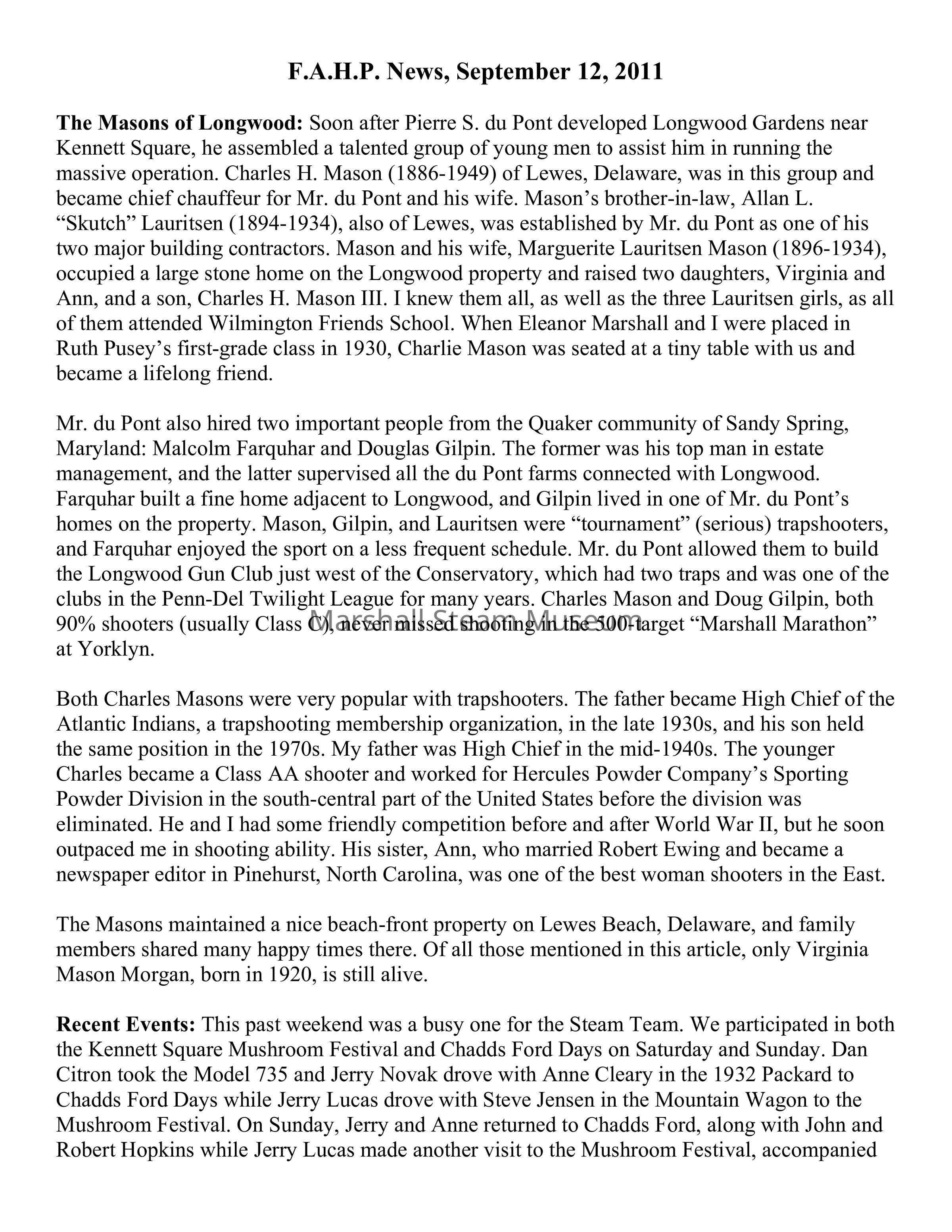 The Masons of Longwood: Soon after Pierre S. du Pont developed Longwood Gardens near Kennett Square, he assembled a talented group of young men to assist him in running the massive operation. Charles H. Mason (1886-1949) of Lewes, Delaware, was in this group and became chief chauffeur for Mr. du Pont and his wife. Mason’s brother-in-law, Allan L. “Skutch” Lauritsen (1894-1934), also of Lewes, was established by Mr. du Pont as one of his two major building contractors. Mason and his wife, Marguerite Lauritsen Mason (1896-1934), occupied a large stone home on the Longwood property and raised two daughters, Virginia and Ann, and a son, Charles H. Mason III. I knew them all, as well as the three Lauritsen girls, as all of them attended Wilmington Friends School. When Eleanor Marshall and I were placed in Ruth Pusey’s first-grade class in 1930, Charlie Mason was seated at a tiny table with us and became a lifelong friend.