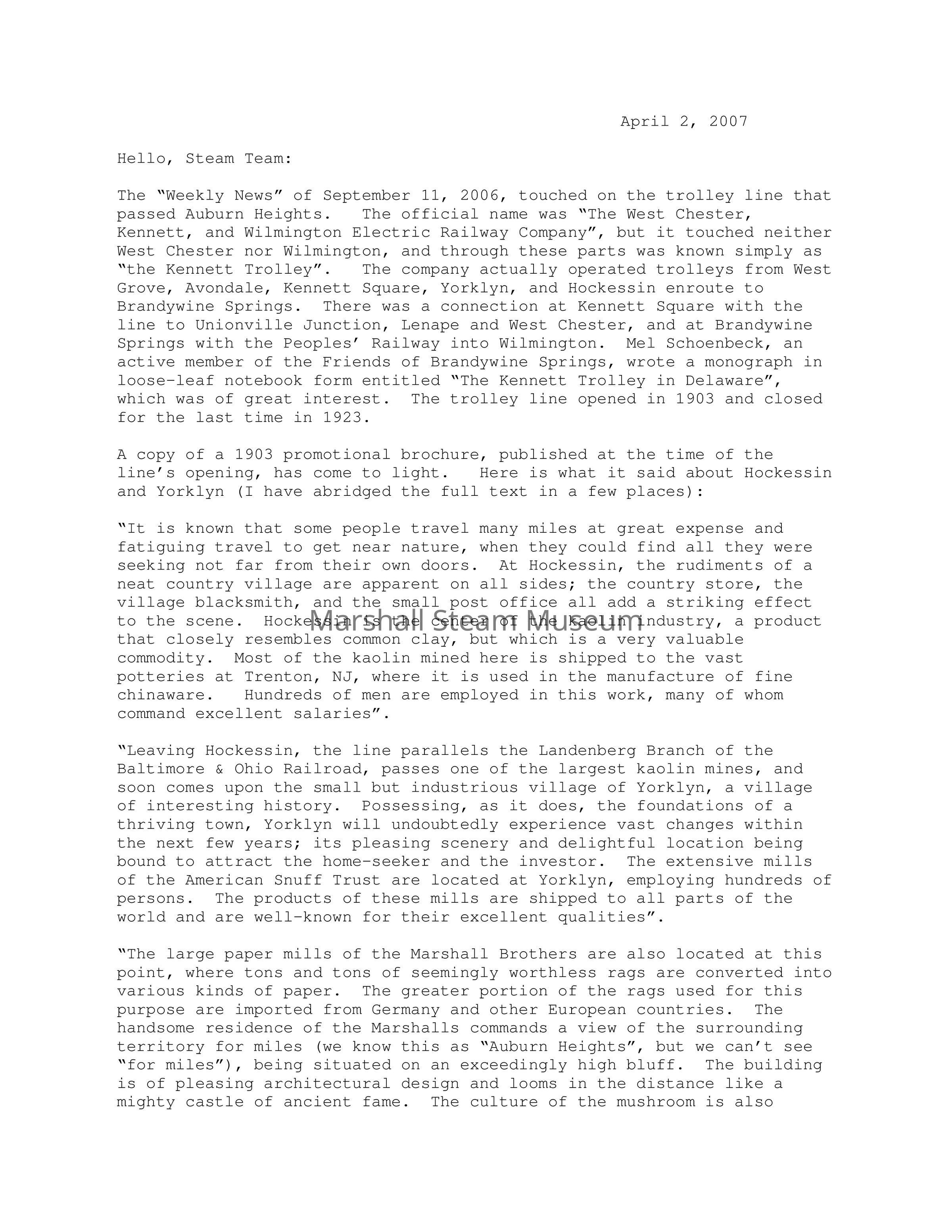 The “Weekly News” of September 11, 2006, touched on the trolley line that passed Auburn Heights. The official name was “The West Chester, Kennett, and Wilmington Electric Railway Company”, but it touched neither West Chester nor Wilmington, and through these parts was known simply as “the Kennett Trolley”. The company actually operated trolleys from West Grove, Avondale, Kennett Square, Yorklyn, and Hockessin enroute to Brandywine Springs. There was a connection at Kennett Square with the line to Unionville Junction, Lenape and West Chester, and at Brandywine Springs with the Peoples’ Railway into Wilmington. Mel Schoenbeck, an active member of the Friends of Brandywine Springs, wrote a monograph in loose-leaf notebook form entitled “The Kennett Trolley in Delaware”, which was of great interest. The trolley line opened in 1903 and closed for the last time in 1923.