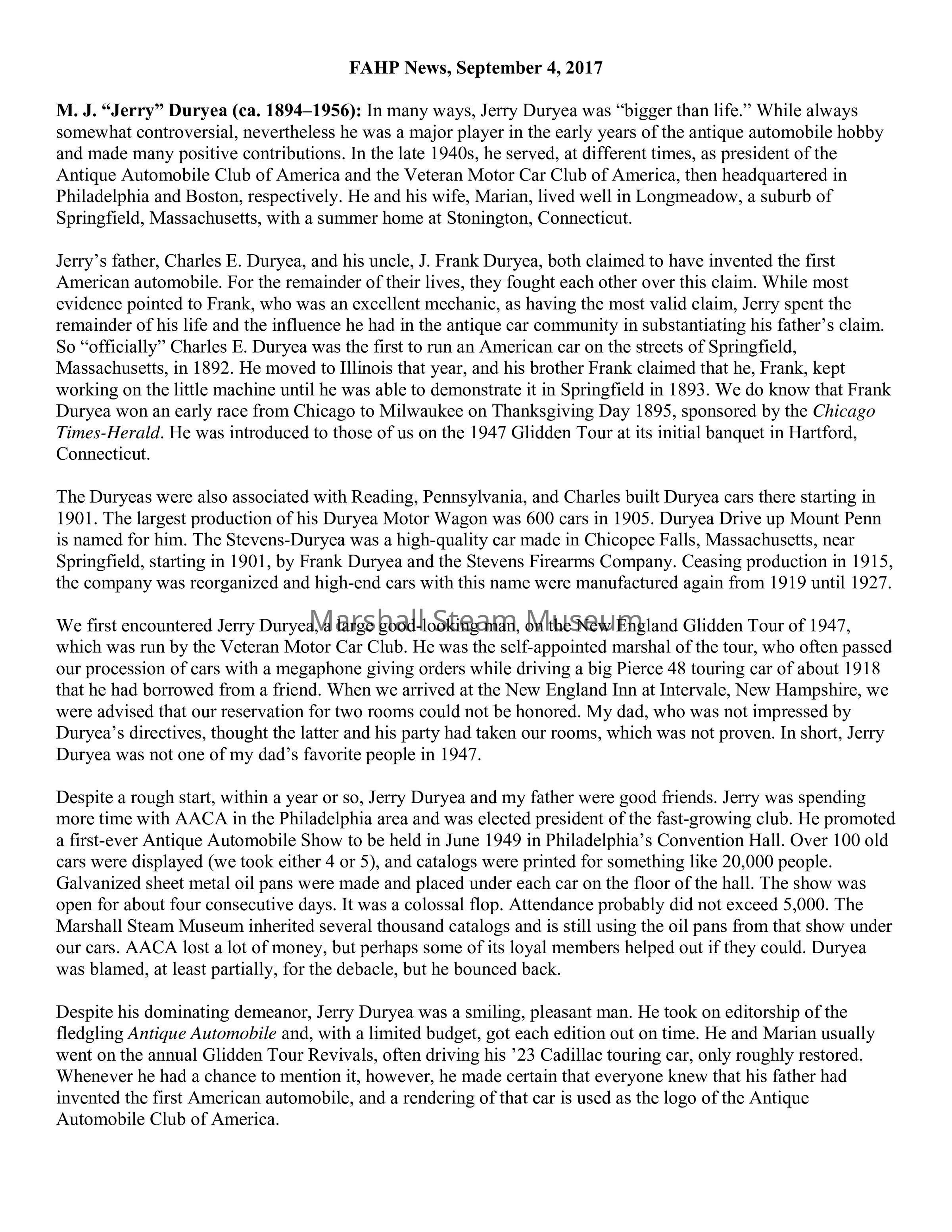 M. J. “Jerry” Duryea (ca. 1894–1956): In many ways, Jerry Duryea was “bigger than life.” While always somewhat controversial, nevertheless he was a major player in the early years of the antique automobile hobby and made many positive contributions. In the late 1940s, he served, at different times, as president of the Antique Automobile Club of America and the Veteran Motor Car Club of America, then headquartered in Philadelphia and Boston, respectively. He and his wife, Marian, lived well in Longmeadow, a suburb of Springfield, Massachusetts, with a summer home at Stonington, Connecticut.