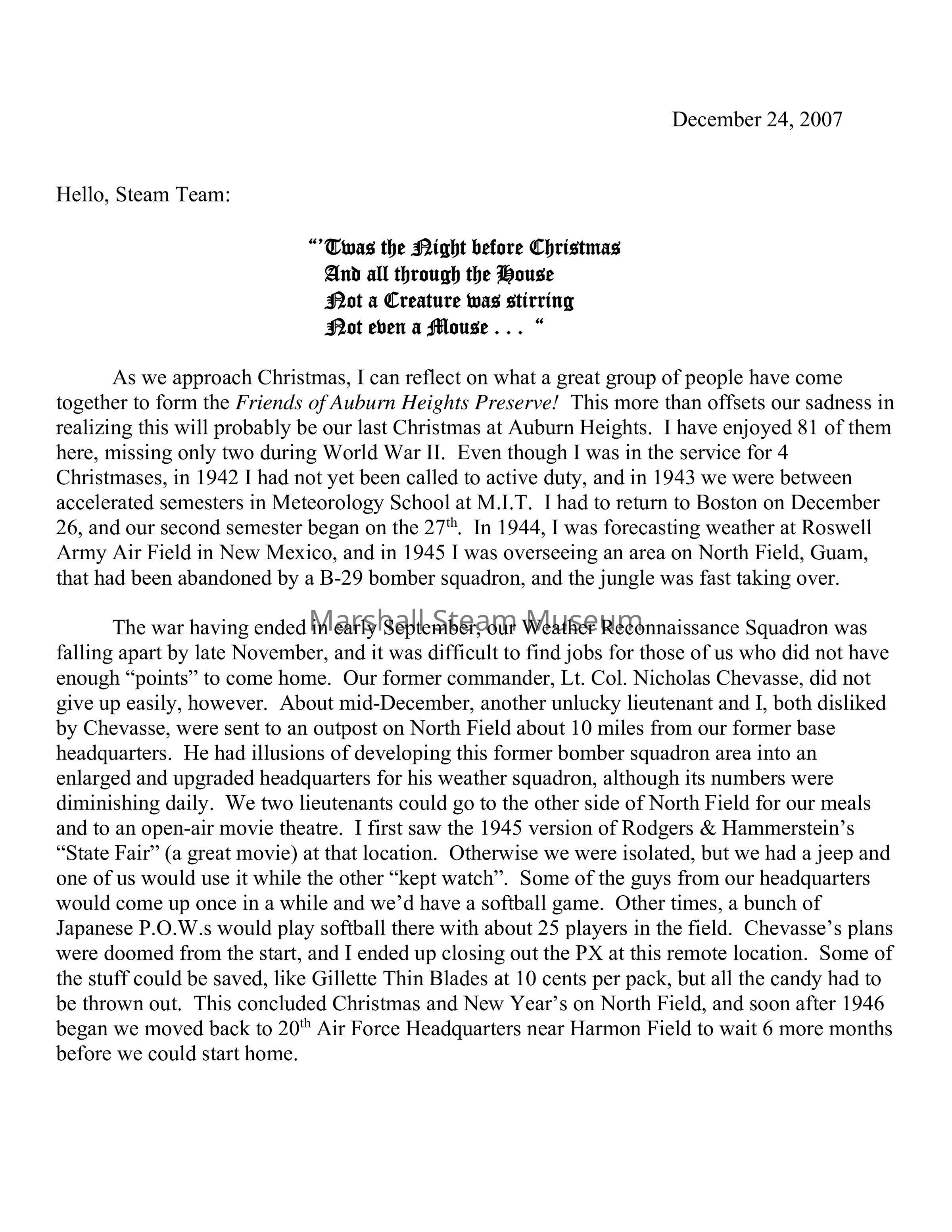 As we approach Christmas, I can reflect on what a great group of people have come together to form the Friends of Auburn Heights Preserve! This more than offsets our sadness in realizing this will probably be our last Christmas at Auburn Heights. I have enjoyed 81 of them here, missing only two during World War II. Even though I was in the service for 4 Christmases, in 1942 I had not yet been called to active duty, and in 1943 we were between accelerated semesters in Meteorology School at M.I.T. I had to return to Boston on December 26, and our second semester began on the 27th. In 1944, I was forecasting weather at Roswell Army Air Field in New Mexico, and in 1945 I was overseeing an area on North Field, Guam, that had been abandoned by a B-29 bomber squadron, and the jungle was fast taking over.