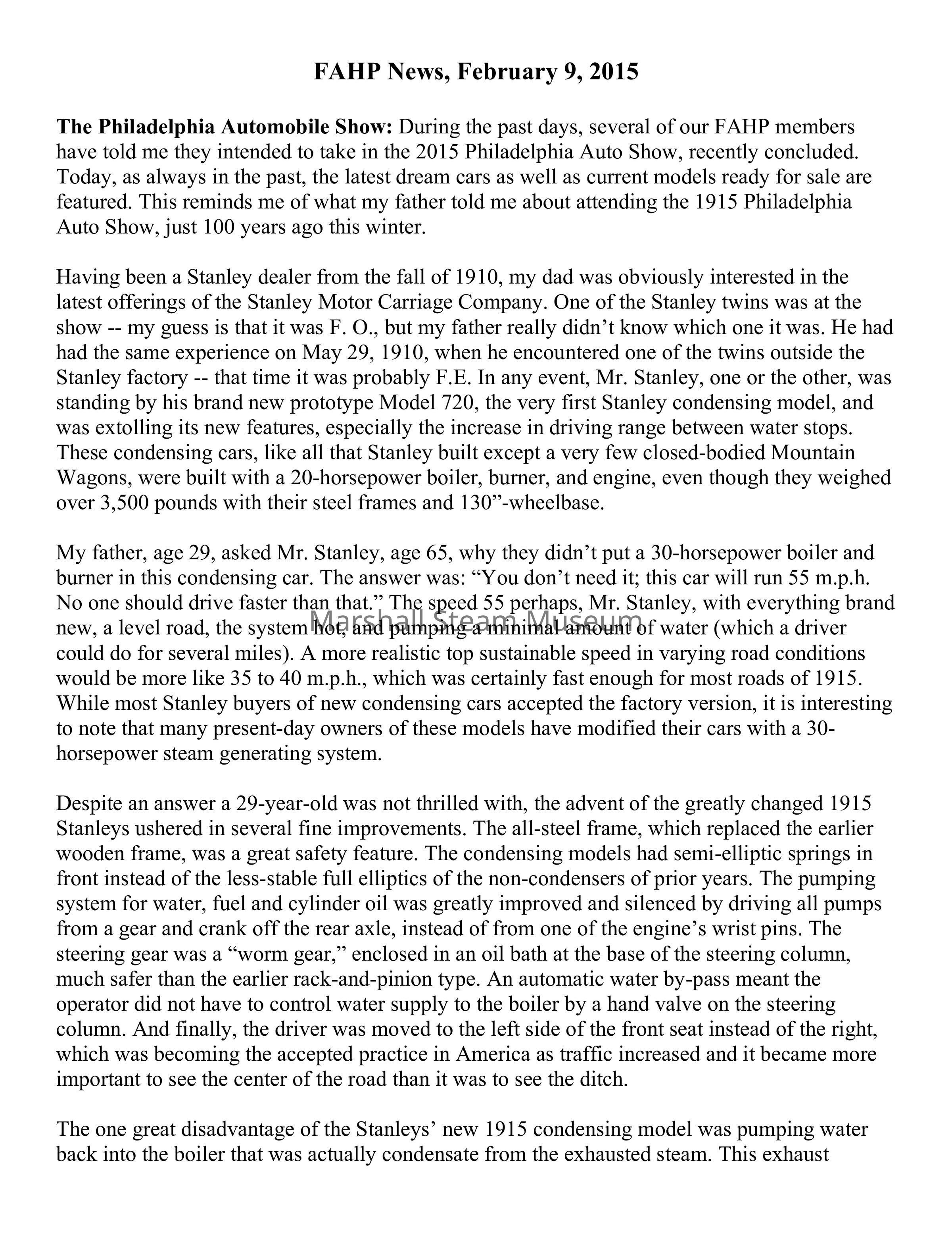 The Philadelphia Automobile Show: During the past days, several of our FAHP members have told me they intended to take in the 2015 Philadelphia Auto Show, recently concluded. Today, as always in the past, the latest dream cars as well as current models ready for sale are featured. This reminds me of what my father told me about attending the 1915 Philadelphia Auto Show, just 100 years ago this winter.
