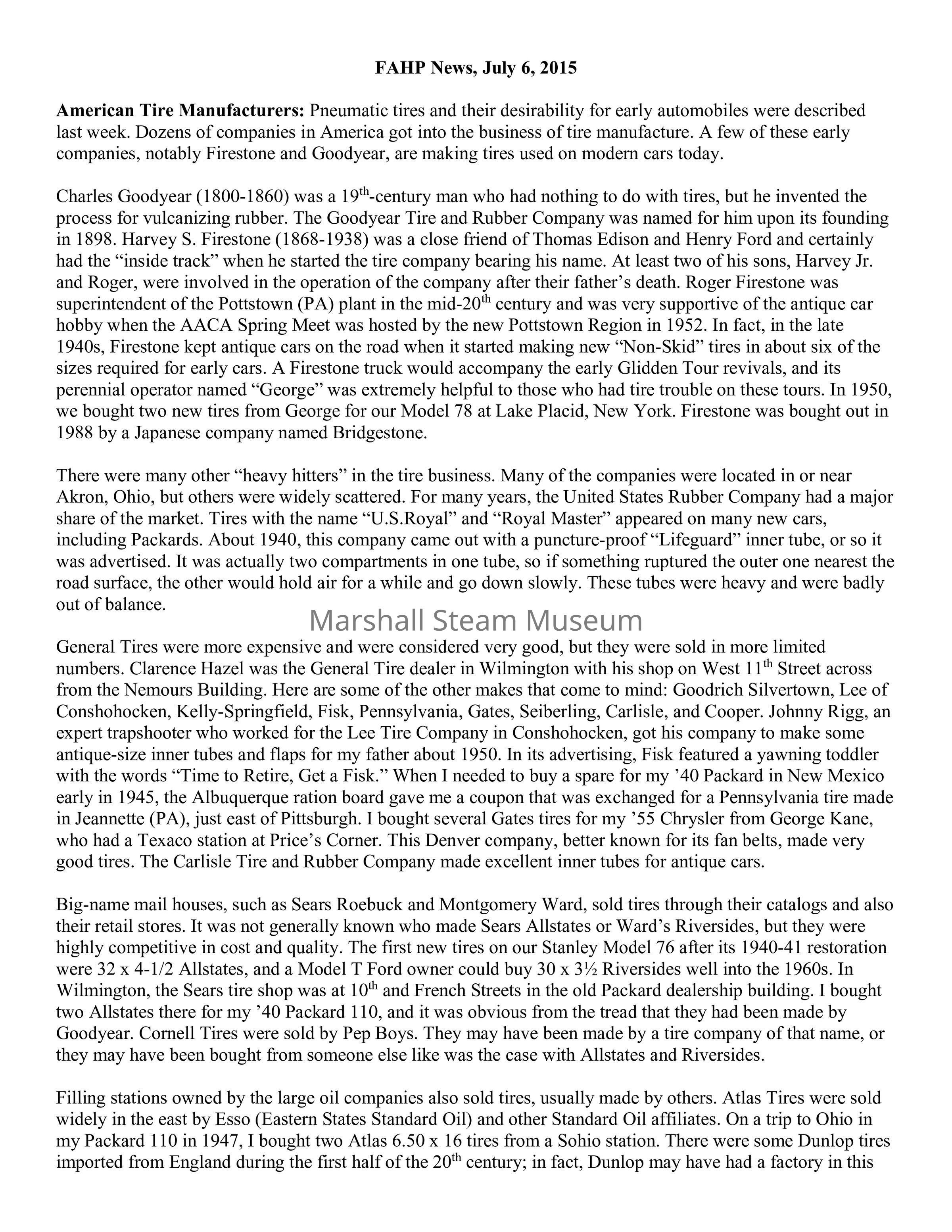American Tire Manufacturers: Pneumatic tires and their desirability for early automobiles were described last week. Dozens of companies in America got into the business of tire manufacture. A few of these early companies, notably Firestone and Goodyear, are making tires used on modern cars today.