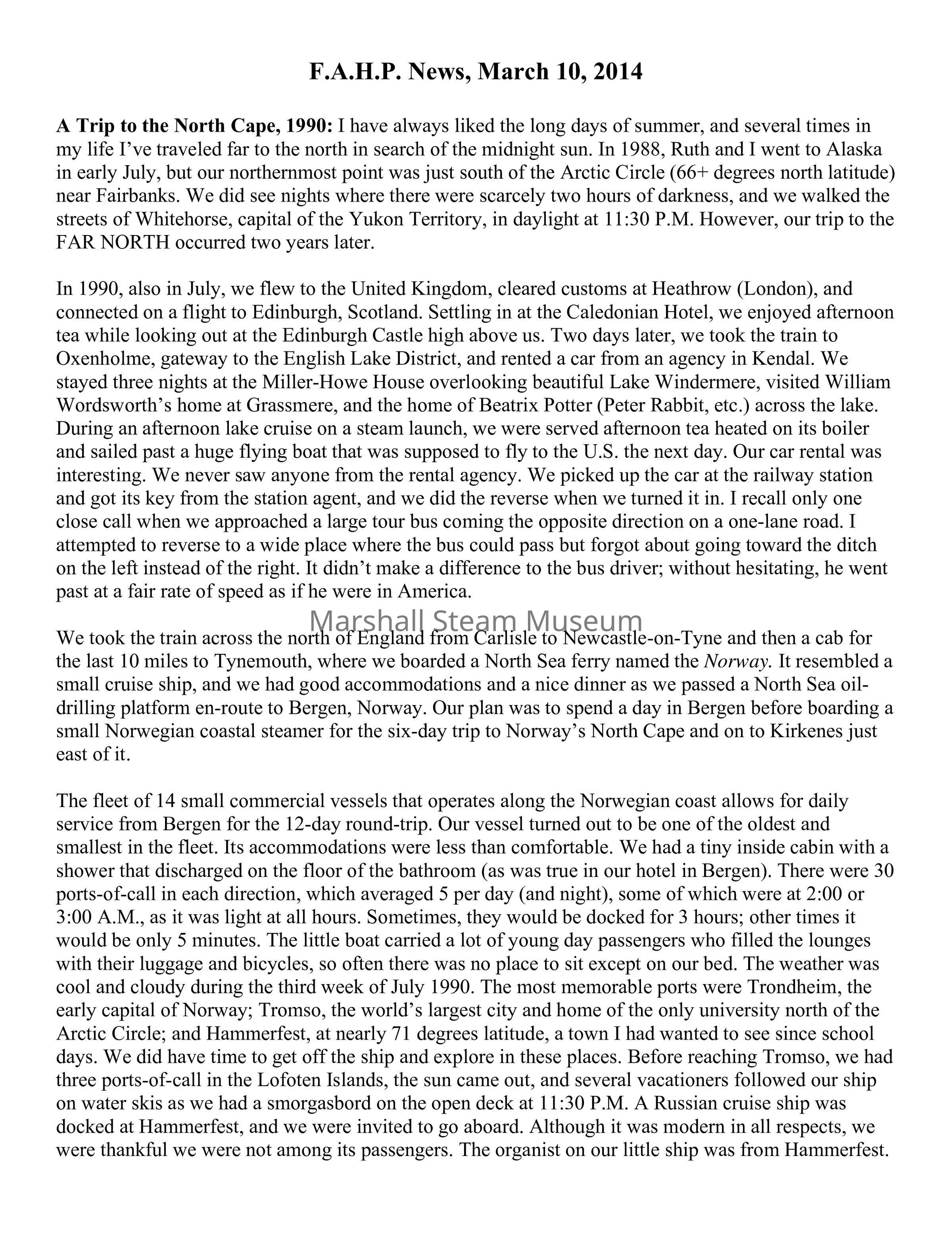 A Trip to the North Cape, 1990: I have always liked the long days of summer, and several times in my life I’ve traveled far to the north in search of the midnight sun. In 1988, Ruth and I went to Alaska in early July, but our northernmost point was just south of the Arctic Circle (66+ degrees north latitude) near Fairbanks. We did see nights where there were scarcely two hours of darkness, and we walked the streets of Whitehorse, capital of the Yukon Territory, in daylight at 11:30 P.M. However, our trip to the FAR NORTH occurred two years later.