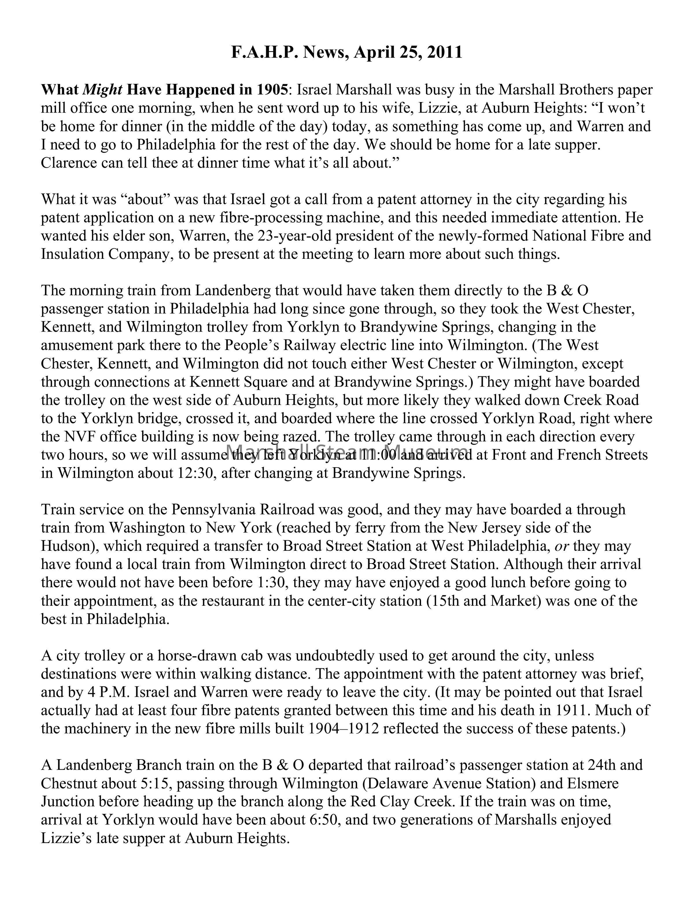 What Might Have Happened in 1905: Israel Marshall was busy in the Marshall Brothers paper mill office one morning, when he sent word up to his wife, Lizzie, at Auburn Heights: “I won’t be home for dinner (in the middle of the day) today, as something has come up, and Warren and I need to go to Philadelphia for the rest of the day. We should be home for a late supper. Clarence can tell thee at dinner time what it’s all about.”