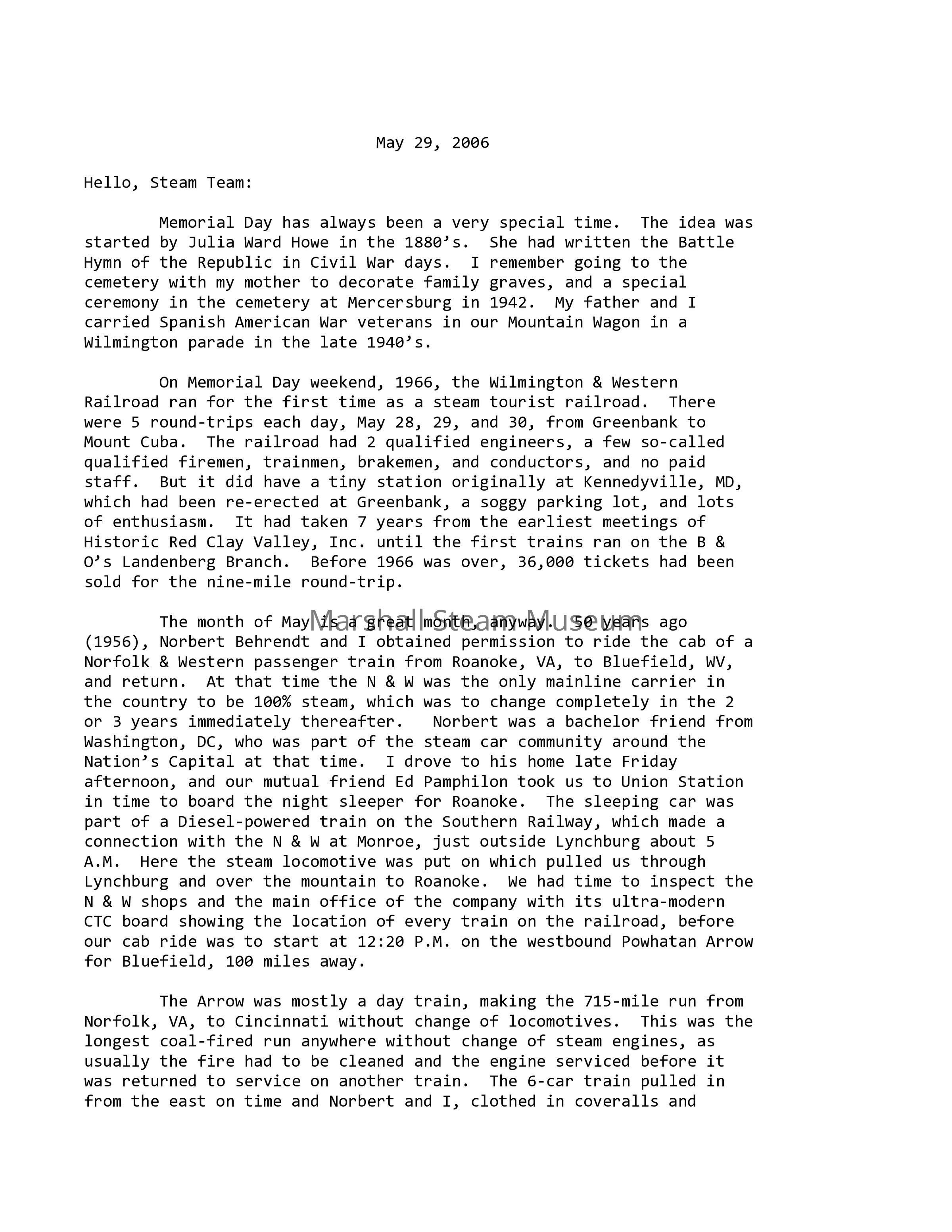 Memorial Day has always been a very special time. The idea was started by Julia Ward Howe in the 1880’s. She had written the Battle Hymn of the Republic in Civil War days. I remember going to the cemetery with my mother to decorate family graves, and a special ceremony in the cemetery at Mercersburg in 1942. My father and I carried Spanish American War veterans in our Mountain Wagon in a Wilmington parade in the late 1940’s.