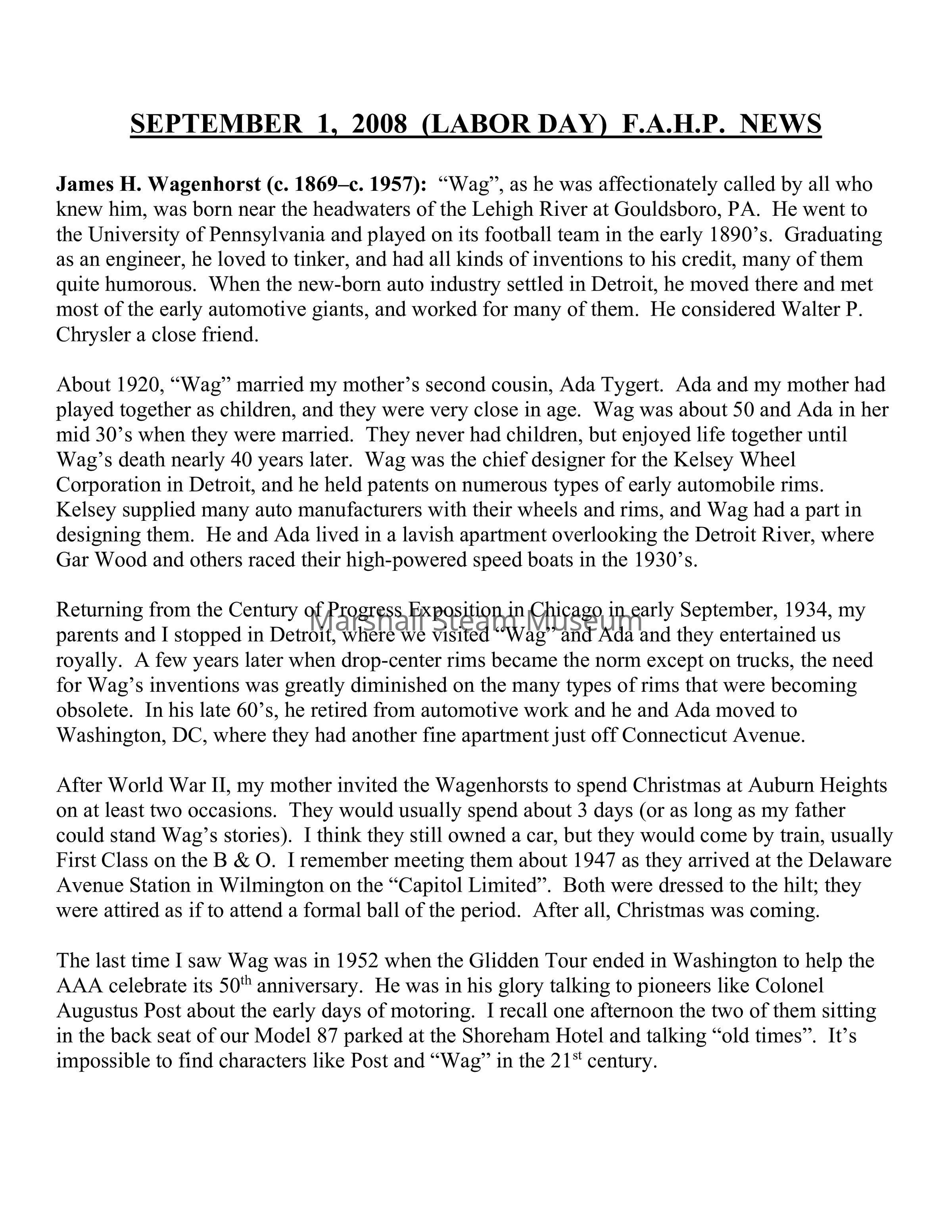 James H. Wagenhorst (c. 1869–c. 1957): “Wag”, as he was affectionately called by all who knew him, was born near the headwaters of the Lehigh River at Gouldsboro, PA. He went to the University of Pennsylvania and played on its football team in the early 1890’s. Graduating as an engineer, he loved to tinker, and had all kinds of inventions to his credit, many of them quite humorous. When the new-born auto industry settled in Detroit, he moved there and met most of the early automotive giants, and worked for many of them. He considered Walter P. Chrysler a close friend.