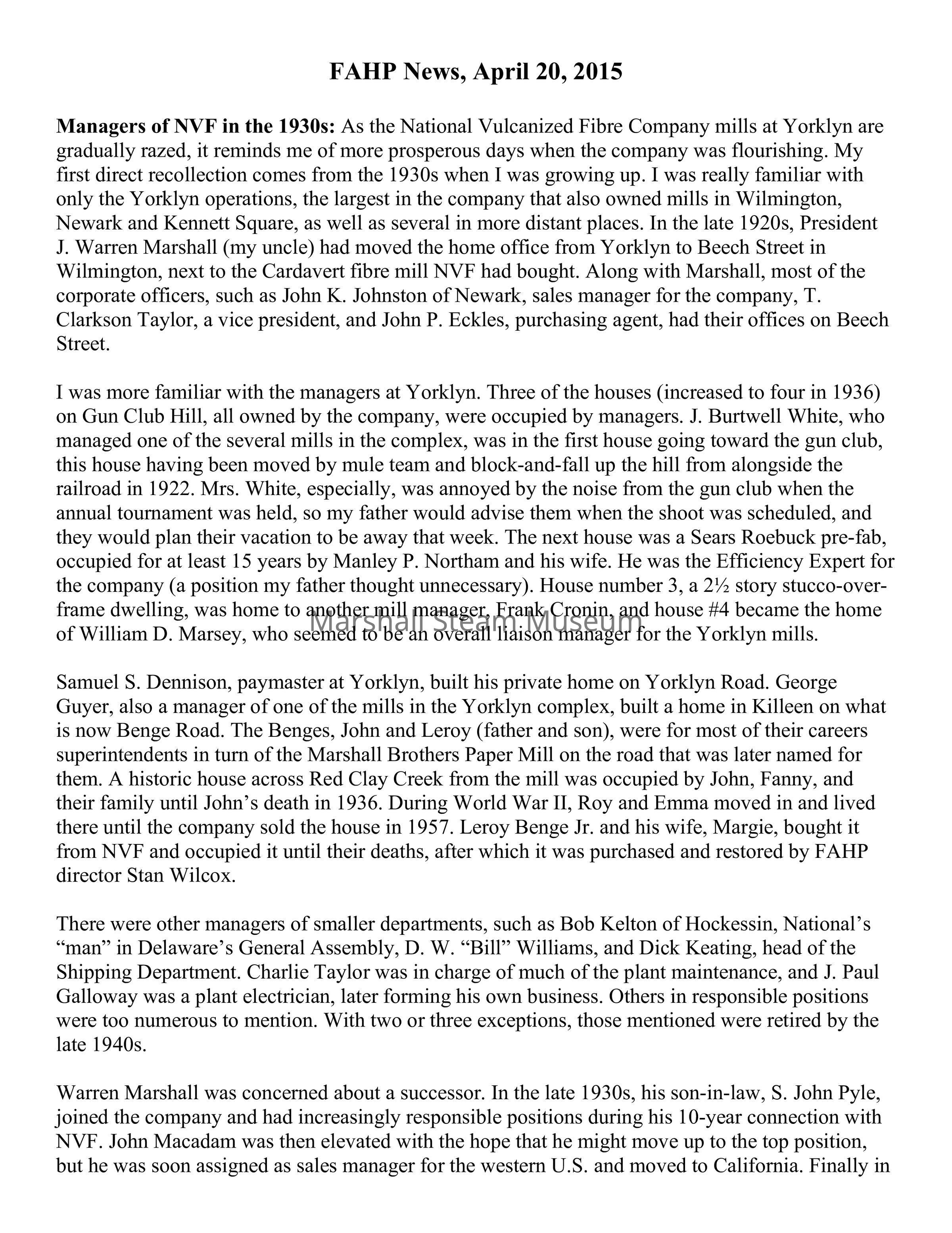 Managers of NVF in the 1930s: As the National Vulcanized Fibre Company mills at Yorklyn are gradually razed, it reminds me of more prosperous days when the company was flourishing. My first direct recollection comes from the 1930s when I was growing up. I was really familiar with only the Yorklyn operations, the largest in the company that also owned mills in Wilmington, Newark and Kennett Square, as well as several in more distant places. In the late 1920s, President J. Warren Marshall (my uncle) had moved the home office from Yorklyn to Beech Street in Wilmington, next to the Cardavert fibre mill NVF had bought. Along with Marshall, most of the corporate officers, such as John K. Johnston of Newark, sales manager for the company, T. Clarkson Taylor, a vice president, and John P. Eckles, purchasing agent, had their offices on Beech Street.