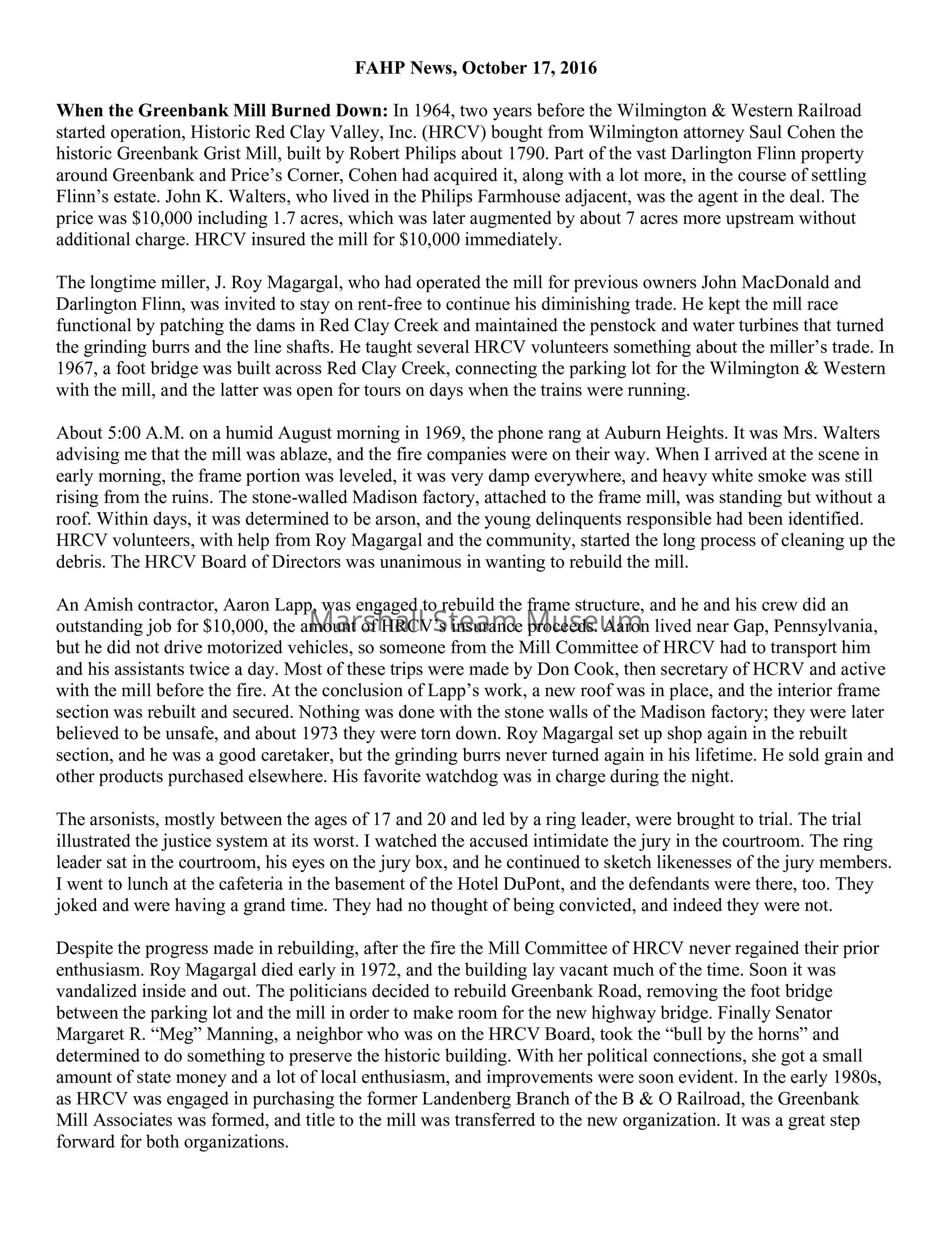 When the Greenbank Mill Burned Down: In 1964, two years before the Wilmington & Western Railroad started operation, Historic Red Clay Valley, Inc. (HRCV) bought from Wilmington attorney Saul Cohen the historic Greenbank Grist Mill, built by Robert Philips about 1790. Part of the vast Darlington Flinn property around Greenbank and Price’s Corner, Cohen had acquired it, along with a lot more, in the course of settling Flinn’s estate. John K. Walters, who lived in the Philips Farmhouse adjacent, was the agent in the deal. The price was $10,000 including 1.7 acres, which was later augmented by about 7 acres more upstream without additional charge. HRCV insured the mill for $10,000 immediately.