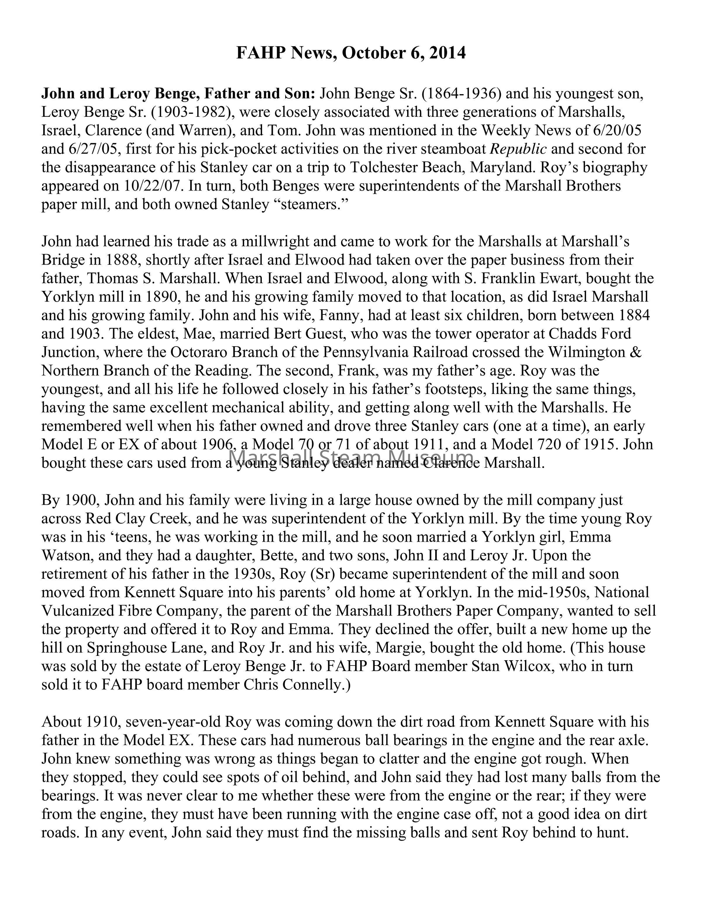 John and Leroy Benge, Father and Son: John Benge Sr. (1864-1936) and his youngest son, Leroy Benge Sr. (1903-1982), were closely associated with three generations of Marshalls, Israel, Clarence (and Warren), and Tom. John was mentioned in the Weekly News of 6/20/05 and 6/27/05, first for his pick-pocket activities on the river steamboat Republic and second for the disappearance of his Stanley car on a trip to Tolchester Beach, Maryland. Roy’s biography appeared on 10/22/07. In turn, both Benges were superintendents of the Marshall Brothers paper mill, and both owned Stanley “steamers.”