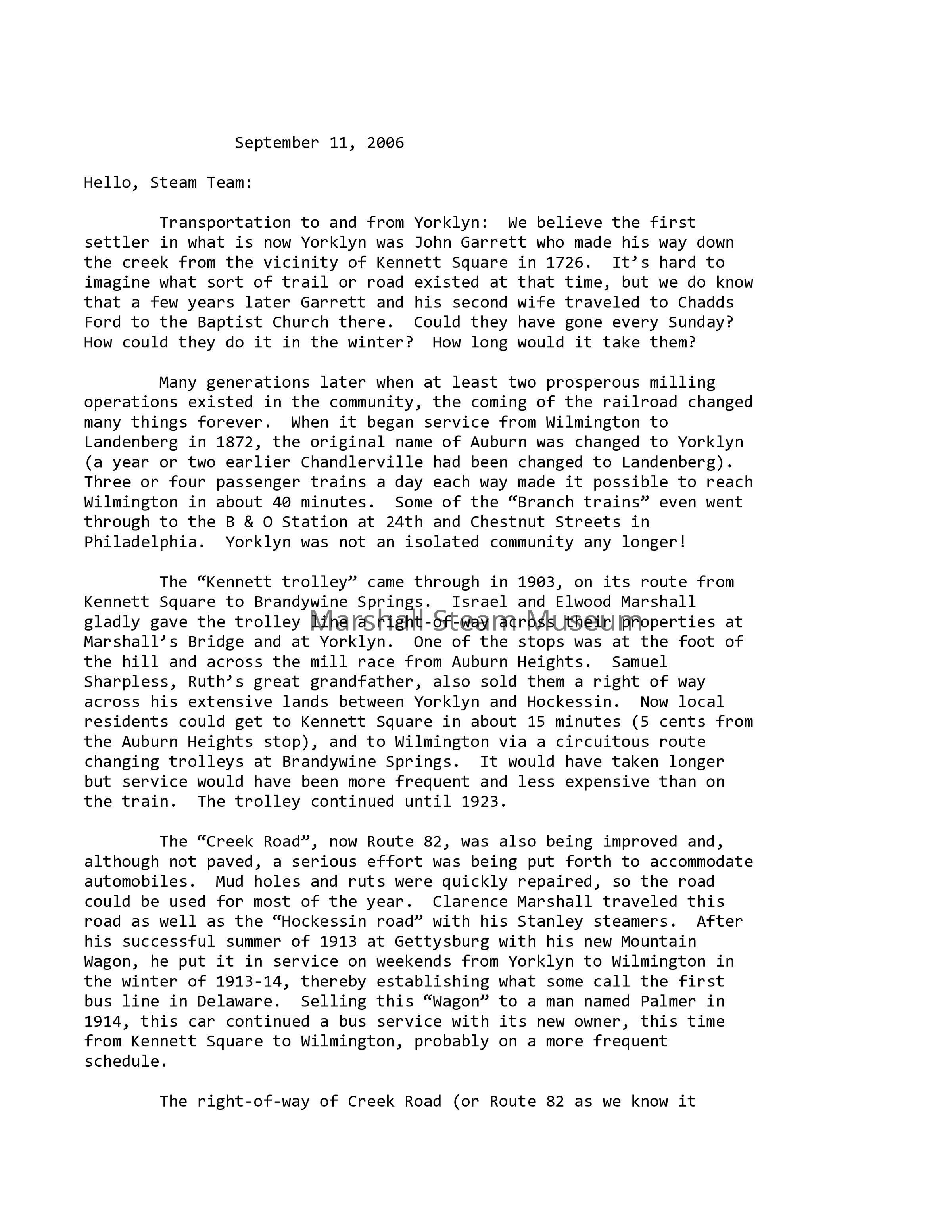 Transportation to and from Yorklyn: We believe the first settler in what is now Yorklyn was John Garrett who made his way down the creek from the vicinity of Kennett Square in 1726. It’s hard to imagine what sort of trail or road existed at that time, but we do know that a few years later Garrett and his second wife traveled to Chadds Ford to the Baptist Church there. Could they have gone every Sunday? How could they do it in the winter? How long would it take them?